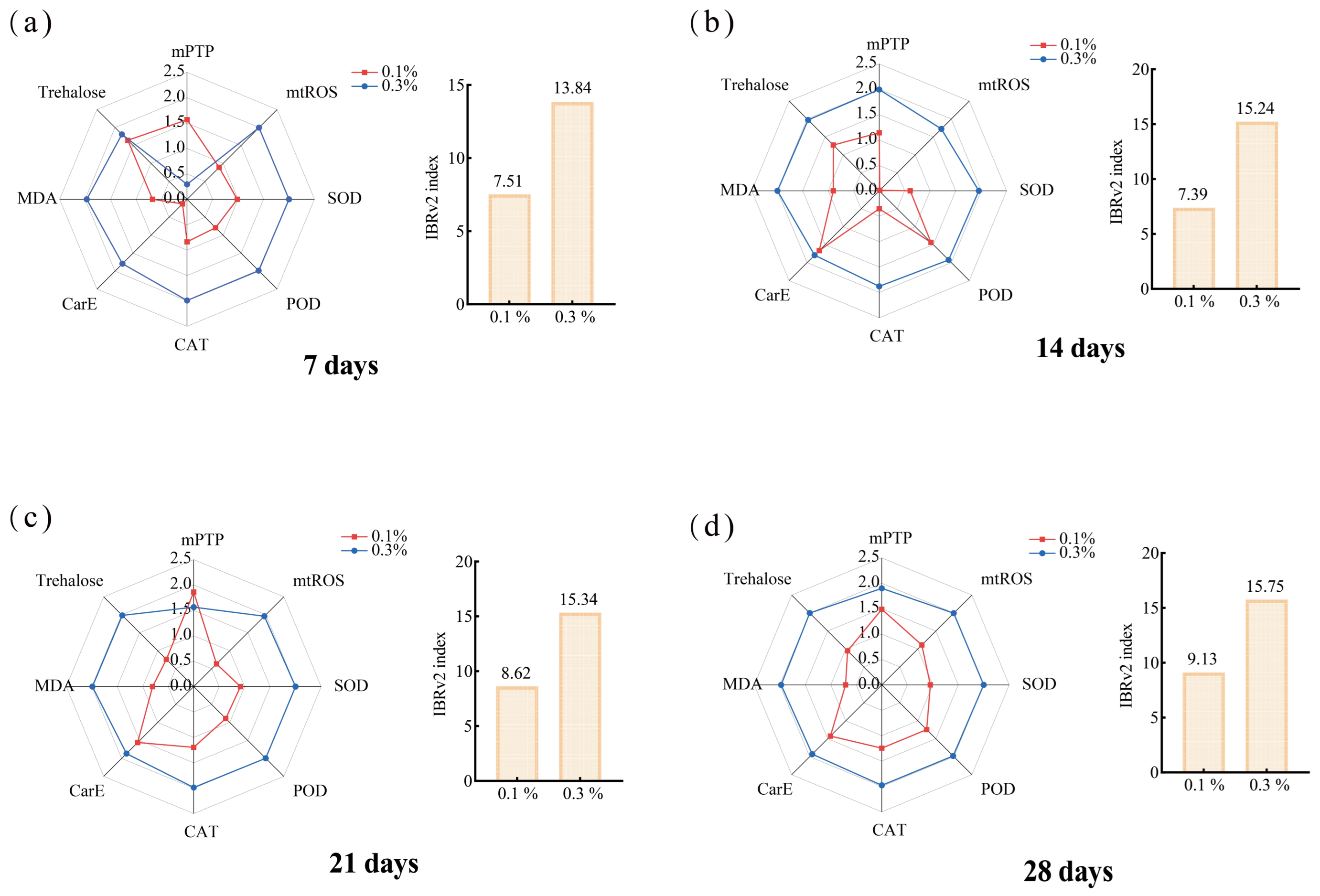 Given that the sensitivity of each indicator to pollutants varies, this study combined each biochemical indicator (mitochondrial ROS, mPTP absorbance, POD, SOD, CAT, CarE, MDA, trehalose) for IBR analysis to assess the ecological risk of GO in the ants. Overall, the GO exhibited the time- and dose-dependent toxicity in the ants, and IBRv2 calculated from these indices indicated the highest biological stress in the 0.3% treatment (Figure 3).