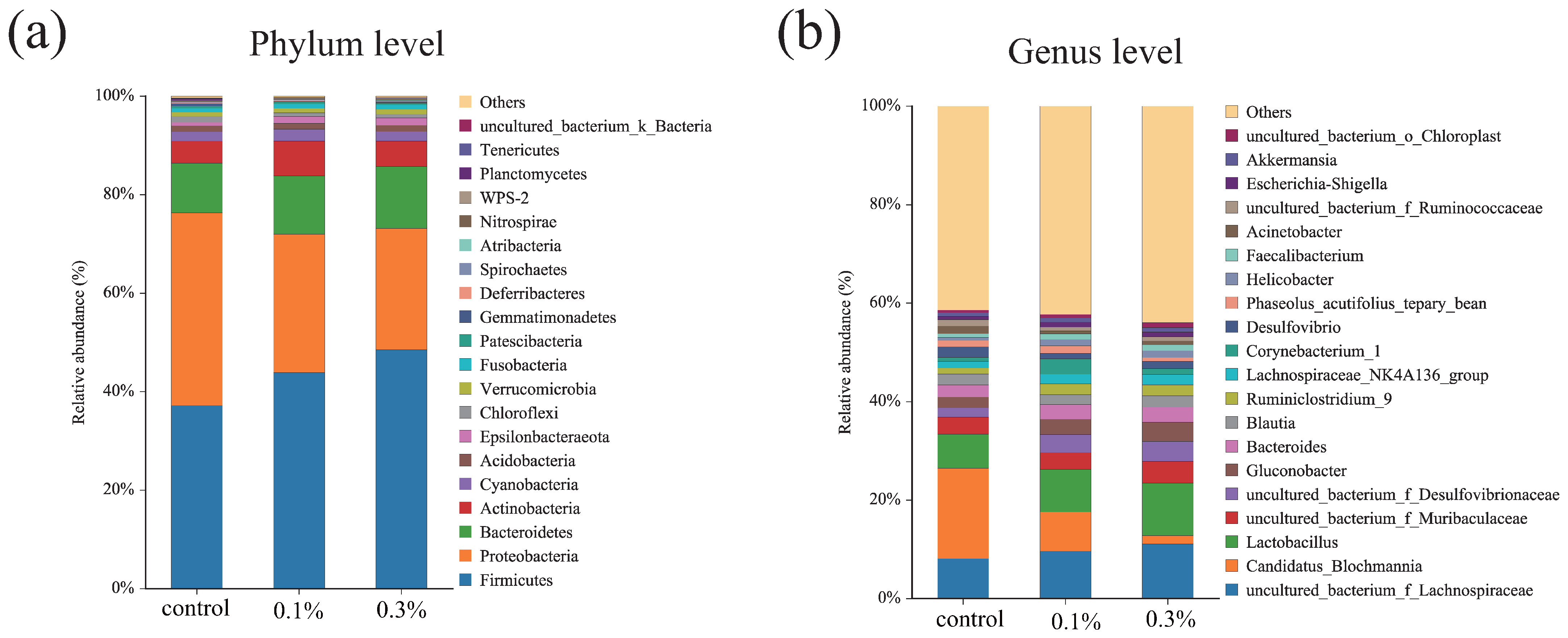 Change in the community composition of gut microbiota after GO exposure: (a) Microbiota composition at the phylum level; (b) Microbiota composition at the genus level.