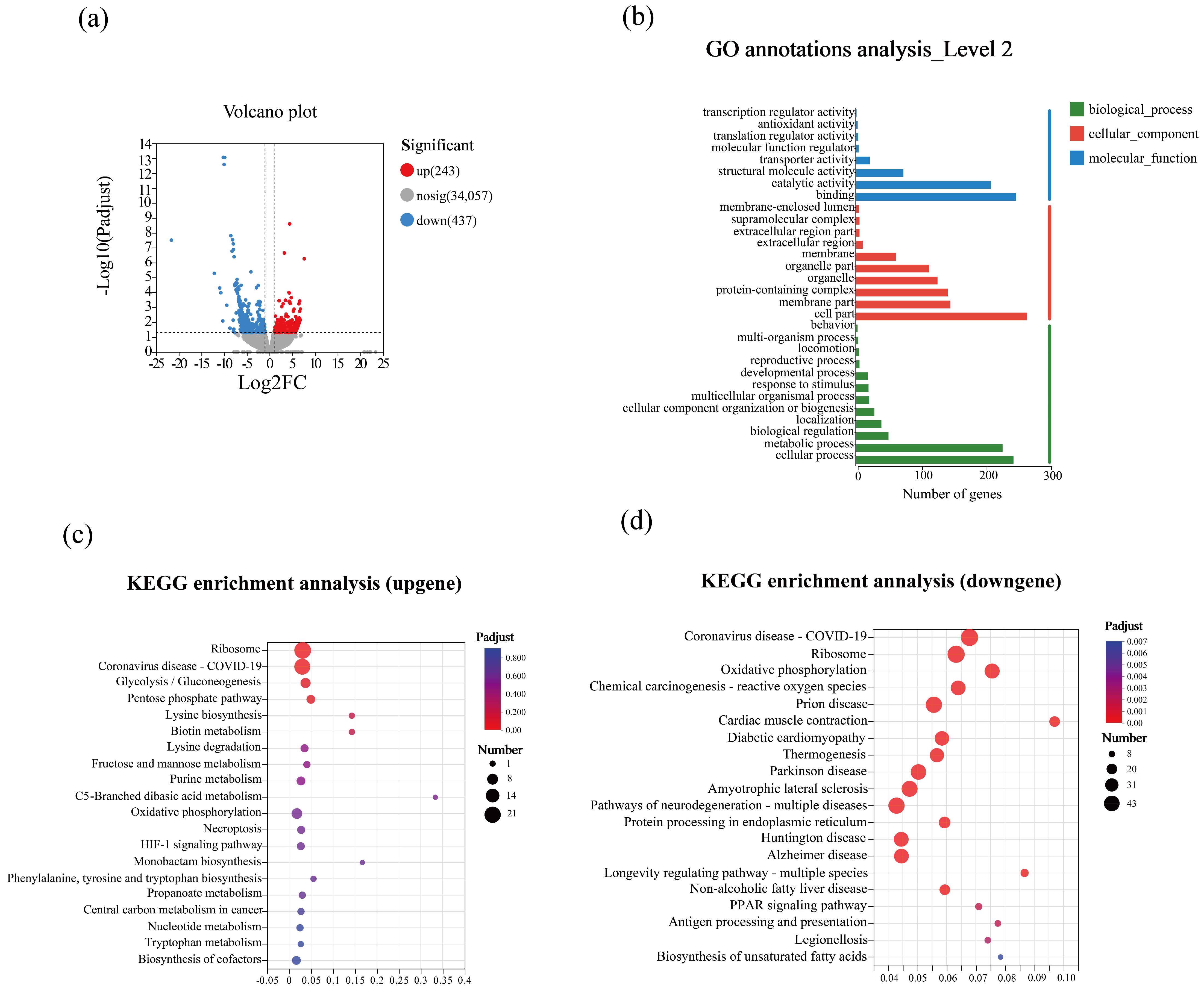 KEGG enrichment analysis was then conducted separately for upregulated and downregulated genes, and the top 20 enriched pathways were visualized as a bubble plot. Overall, enriched pathways were mainly related to energy metabolism, carbohydrate metabolism, and environmental adaptation. Among the upregulated DEGs, enriched pathways included glycolysis/gluconeogenesis, pentose phosphate pathway, and oxidative phosphorylation (Figure 6c). Among downregulated DEGs, significant enrichment was observed in oxidative phosphorylation, chemical carcinogenesis–reactive oxygen species, and neurodegeneration–multiple diseases pathways (Figure 6d).