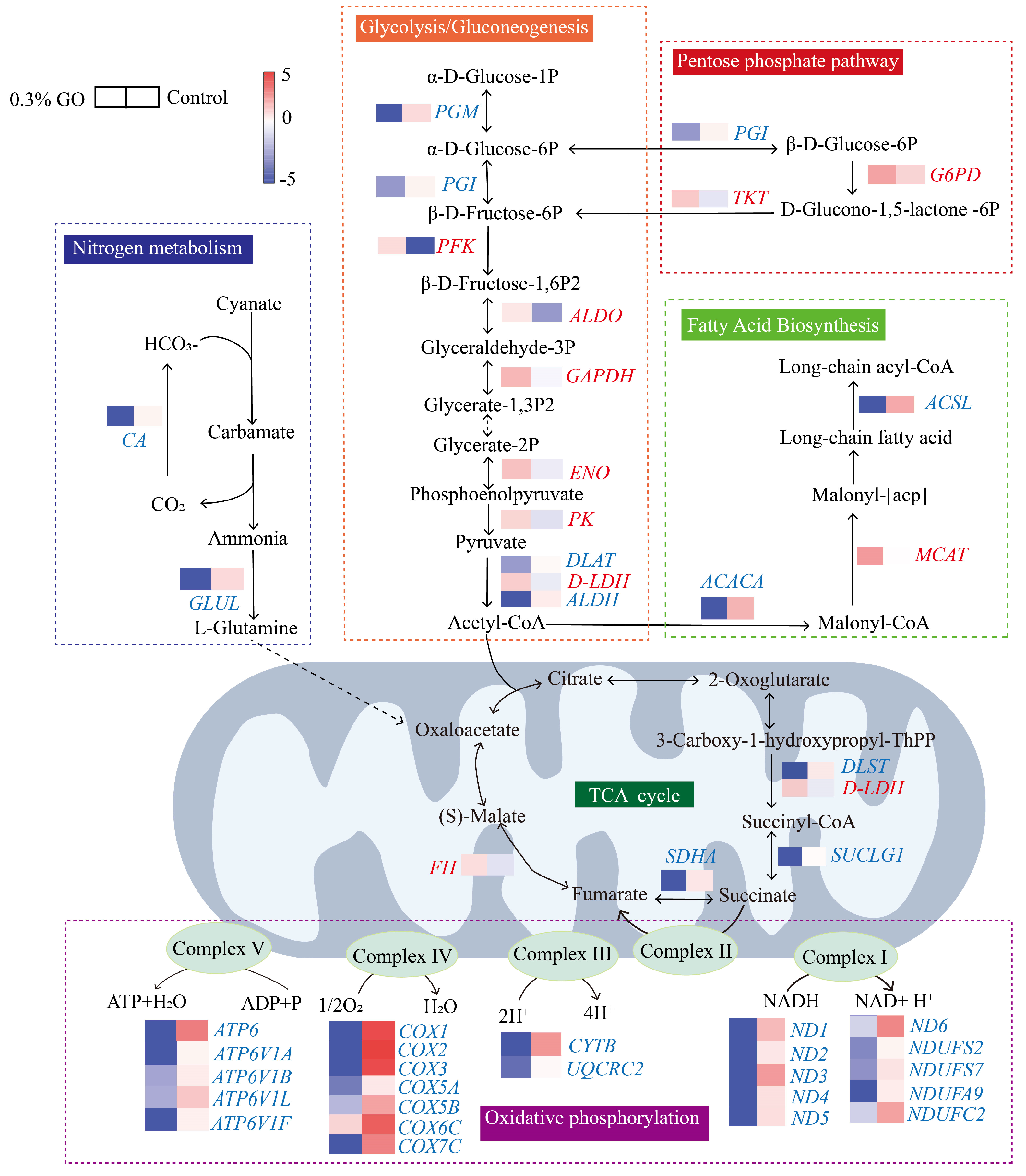 Integrated KEGG pathway map. Different metabolic pathways are enclosed in colored frames. The TCA cycle is depicted within the mitochondrion. Heatmap shows log2 (mean TPM). In the heatmaps, the left bars represent the 0.3% treatment, and the right bars represent the control group. Gene names adjacent to the heatmaps, upregulation of DEGs is labeled in red, and downregulation of DEGs is labeled in blue.