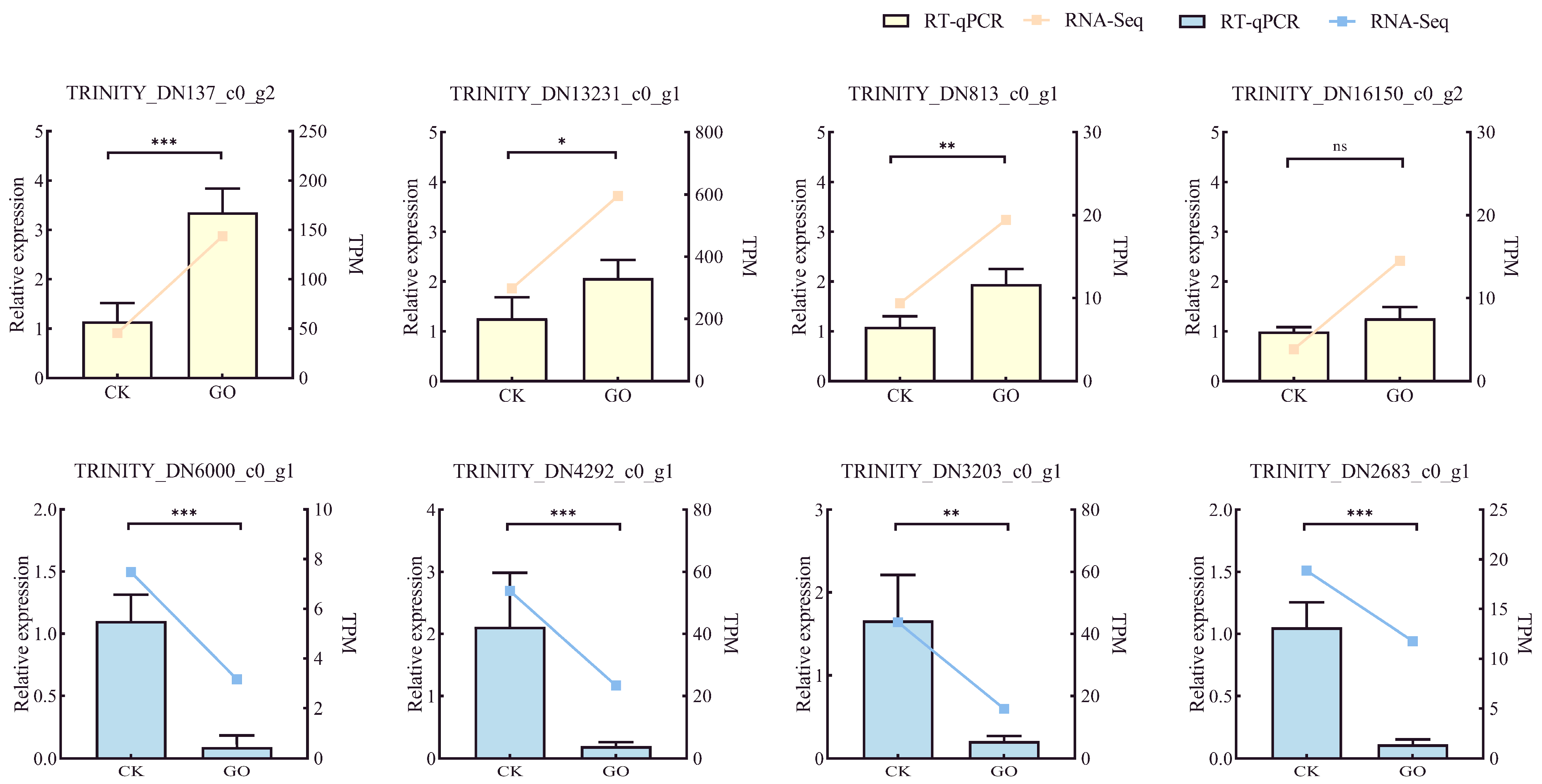 To validate the RNA-seq results, eight genes associated with energy metabolism, redox regulation, and other key biological processes were selected for RT-qPCR, including the DEGs TRINITY_DN137_c0_g2 (carbohydrate metabolism), TRINITY_DN13231_c0_g1 (oxidoreductase activity), TRINITY_DN16150_c0_g2 (mitochondrial membrane), TRINITY_DN6000_c0_g1 (ion binding), TRINITY_DN2683_c0_g1 (peroxisome), TRINITY_DN3203_c0_g1 (lipid metabolism), TRINITY_DN813_c0_g1 (olfactory transduction), and TRINITY_DN4292_c0_g1 (unannotated). The RT-qPCR results were consistent with the RNA-Seq data, showing similar expression trends for all eight genes (Figure 8).