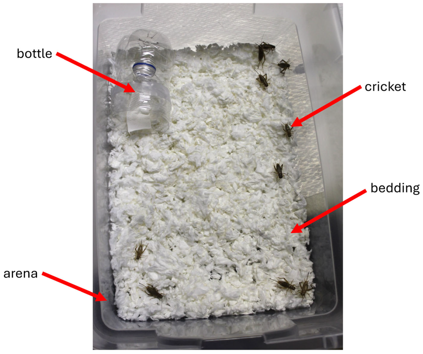 Top-down view of the behavioral bioassay showing the inverted bottle, crickets, bedding, and plastic arena (lid removed). Ten crickets were allowed to explore freely in the arena during the experiment. The inverted bottle contained either an essential oil (test) or alcohol (control).