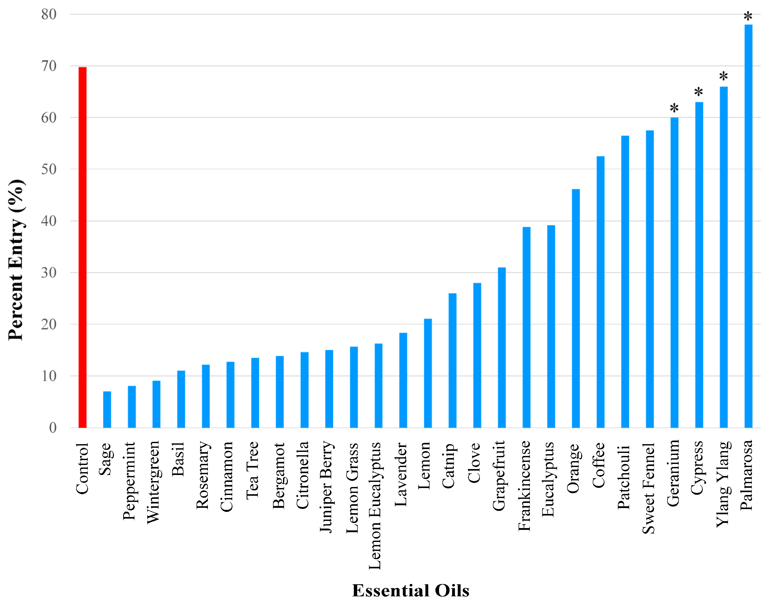 Overall results showing the degree of repellency elicited by 27 essential oils. Repellency was expressed as percent entry into a plastic bottle containing a test essential oil. Ethanol was used for all control experiments. Percent entry for test compounds was compared with that for the control compound (69.8%). Asterisks indicate essential oils that did not elicit significant repellency.
