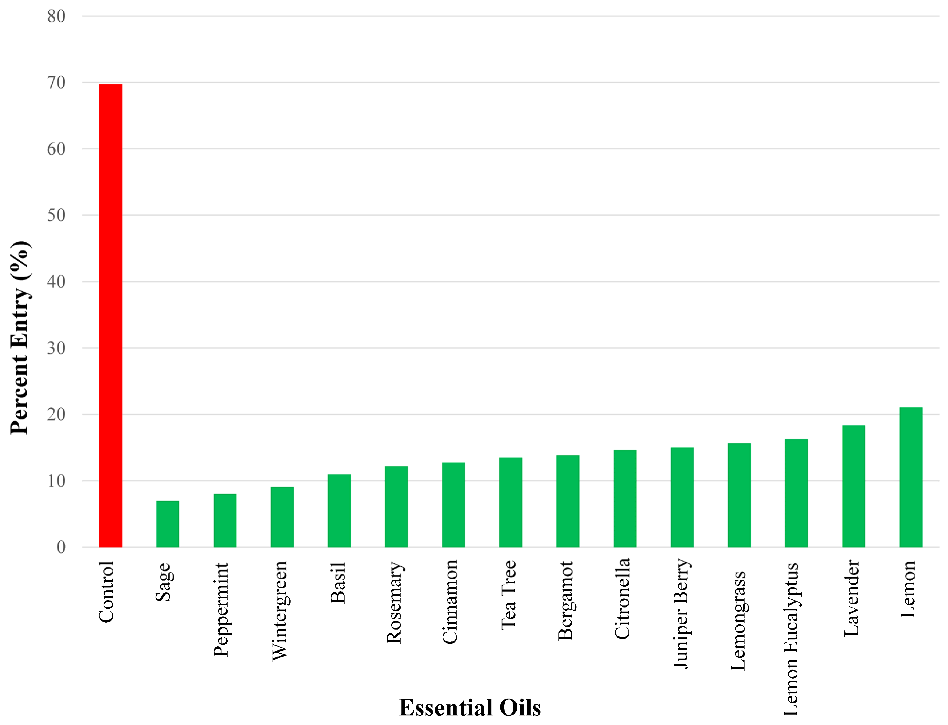 In terms of percent entry into bottles with test compounds, we found 14 essential oils that elicited between 7 and 21.1% entry. In ascending order, the strongest repellency using a 50 µg dose was found for the following essential oils (Figure 3): sage (7.00%), peppermint (8.06%), wintergreen (9.09%), basil (11.0%), rosemary (12.2%), cinnamon (12.7%), tea tree (13.5%), bergamot (13.8%), citronella (14.6%), juniper berry (15.0%), lemon grass (15.%), lemon eucalyptus (16.3%), lavender (18.3%), and lemon (21.1%).