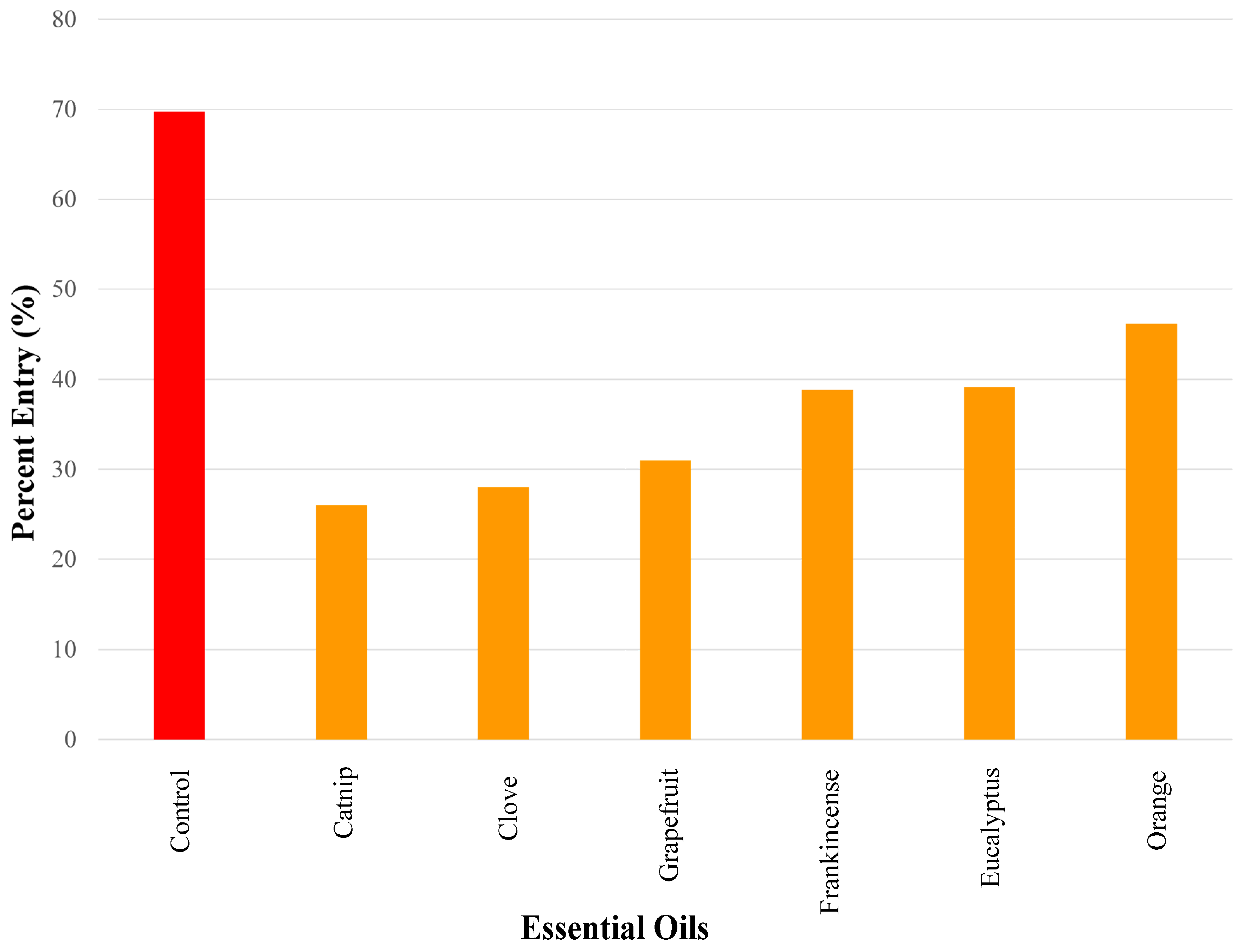 Repellency results of the essential oils exhibiting the strongest repellency (i.e., percent entry range: 0–25%) using a 50 µg dose are shown. Repellency was expressed as percent entry into a plastic bottle containing the test compound (i.e., essential oil). Ethanol was used for all control experiments. Percent entry for test compounds was compared with that for the control compound (69.8%). All essential oils in this figure elicited significant repellency.