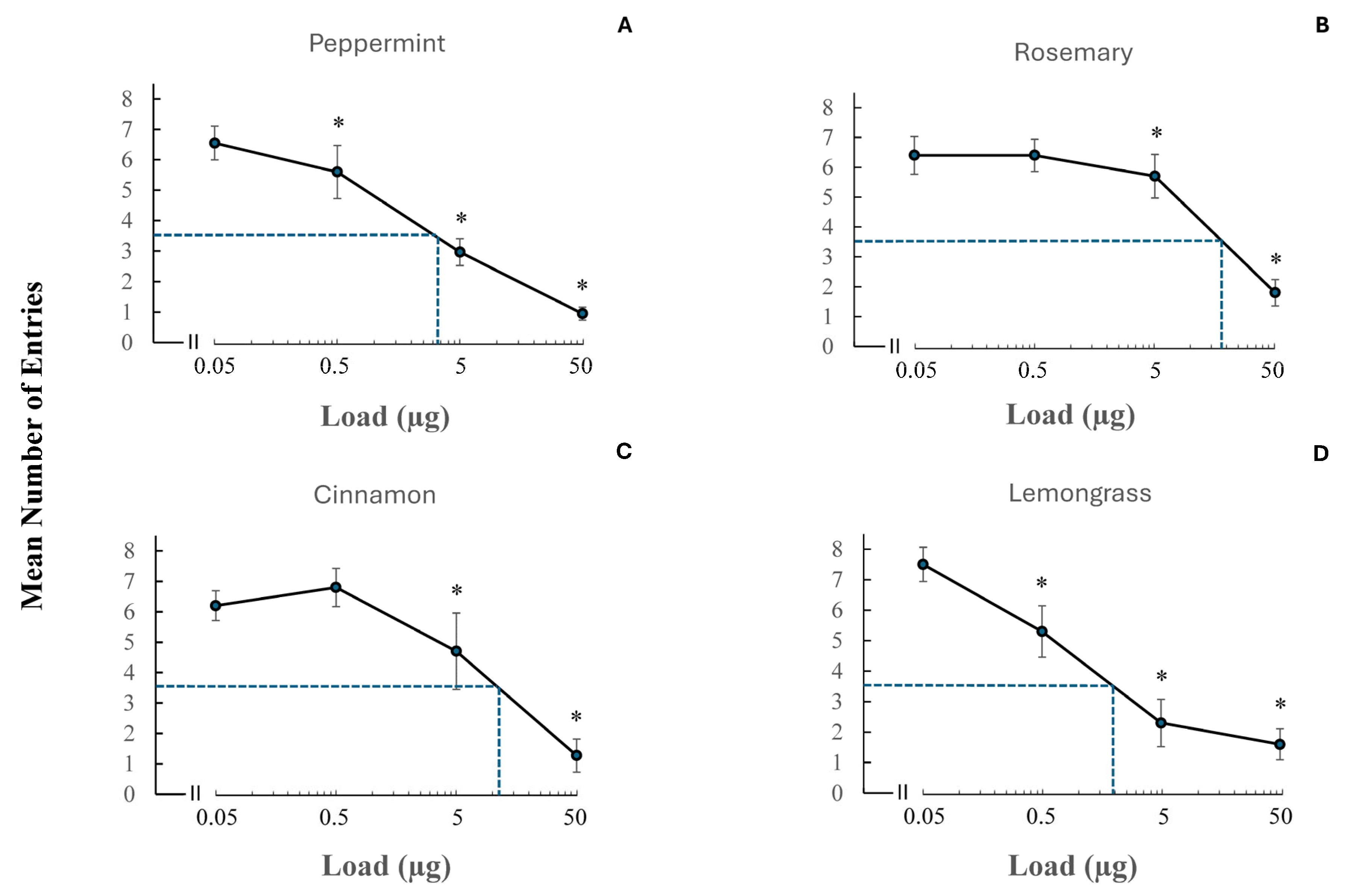 From those essential oils eliciting strong repellency, four were selected (i.e., peppermint, rosemary, cinnamon, and lemongrass) to determine their dose–response dynamics at four different concentrations (0.05 µg, 0.5 µg, 5 µg, and 50 µg) (Figure 6). In all cases, we observed a decrease in the mean number of entries into the test bottle with increasing concentration. Differently shaped sigmoid curves were noted. The RT (repellency threshold) concentration (i.e., lowest concentration at which repellency was significantly different from that of the control) was determined for each of the four essential oils. Statistical significance was considered for p-values smaller than 0.05 and Yates values were reported for these four essential oils and doses: (Yates, 150.65, p < 0.0001, Yates, 77,2, p < 0.0001, Yates, 5.02, p < 0.0251, Yates, 0.65, p < 0.4201 for 50 µg, 5 µg, 0.5 µg, and 0.05 µg peppermint, respectively, Yates, 70.18, p < 0.0001, Yates, 4.3, p < 0.0381, Yates, 0.77, p < 0.3802, Yates, 0.65, p < 0.4201 for 50 µg, 5 µg, 0.5 µg, and 0.05 µg rosemary, respectively, Yates, 59.39, p < 0.0001, Yates, 13.87, p < 0.0002, Yates, 0.03, p < 0.8625, Yates, 1.5, p < 0.2207 for 50 µg, 5 µg, 0.5 µg, and 0.05 µg cinnamon, respectively, and Yates, 48.74, p < 0.0001, Yates, 57.37, p < 0.0001, Yates, 7.5, p < 0.0062, Yates, 0.67, p < 0.4131 for 50 µg, 5 µg, 0.5 µg, and 0.05 µg lemongrass, respectively. In the case of both peppermint and lemongrass, the RT was 0.05 µg, whereas for rosemary and cinnamon, this value was 0.5 µg. We estimated the RD50 concentration (concentration at 50% of the population of insects in the test group were repelled). As the control compound elicited 69.8% (~70%) and not 100% entry into control bottles, the concentration of 35% (i.e., 50% of control entries) was used as the RD50 value for test compounds. Since, on average, seven out of ten insects entered the bottle in control experiments, the RD50 value was set to 3.5 number of entries (see y axes in Figure 6). In the case of lemon grass, peppermint, cinnamon, and rosemary, these RD50 values were found to be approximately 1.1 µg, 2.3 µg, 6.8 µg, and 10 µg, respectively.