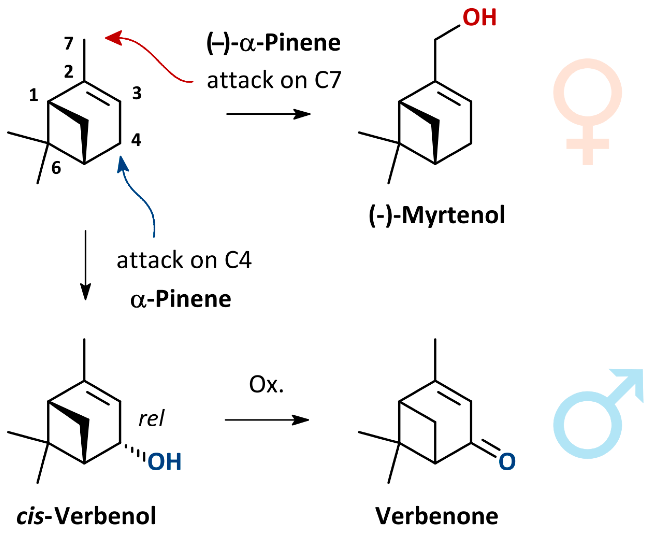 | verbenone | 3. | male | anti-aggregation pheromone | It has an anti-aggregation, repellent effect for both sexes [61]. |