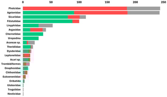 Rank-abundance graph of arachnid families and other higher taxa found across Levantine caves by cave type: arthropods from caves inhabited by frugivorous bats in green, arthropods from caves inhabited by insectivorous bats in red, and arthropods from caves without bats in gray. The taxa are sorted by their total abundance in caves. Spider (Araneae) families: Pholcidae, Agelenidae, Sicariidae, Filistatidae, Linyphiidae, Theridiidae, Dysderidae, Leptonetidae, Gnaphosidae, Uloboridae and Nesticidae; Ticks (Ixodida): Argasidae; Pseudoscorpiones families: Chernetidae, Chthoniidae; Acari: Mesostigmata: Uropodina; Trombidiformes; Oribatidae; acari unidentified; Palpigradi: Eukoeneniidae; Harvestman (Opiliones) families: Trogulidae.