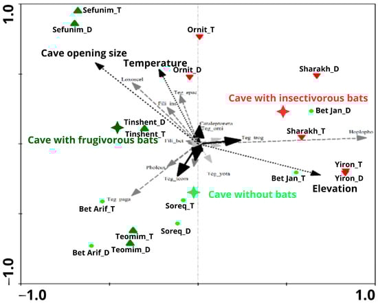 CCA ordination graph of the first and second axes, testing nine caves with three different types of bat colonies (frugivorous, insectivorous, and without bats) from two zones (twilight and dark) and troglobite/troglophile arachnid species. The significant explanatory variables (elevation, temperature, and cave opening size) are plotted on the graph, as are the cave and species names. Cave types are represented as follows: cave with frugivorous bats: dark green triangle; cave with insectivorous bats: red triangle; cave without bats: lime green dots. Troglobite species are indicated by black arrows, troglophile species by gray arrows, and visitor species by light gray arrows. Nominal explanatory variable is shown by a black star, and continuous explanatory variables by arrows with a dashed line.