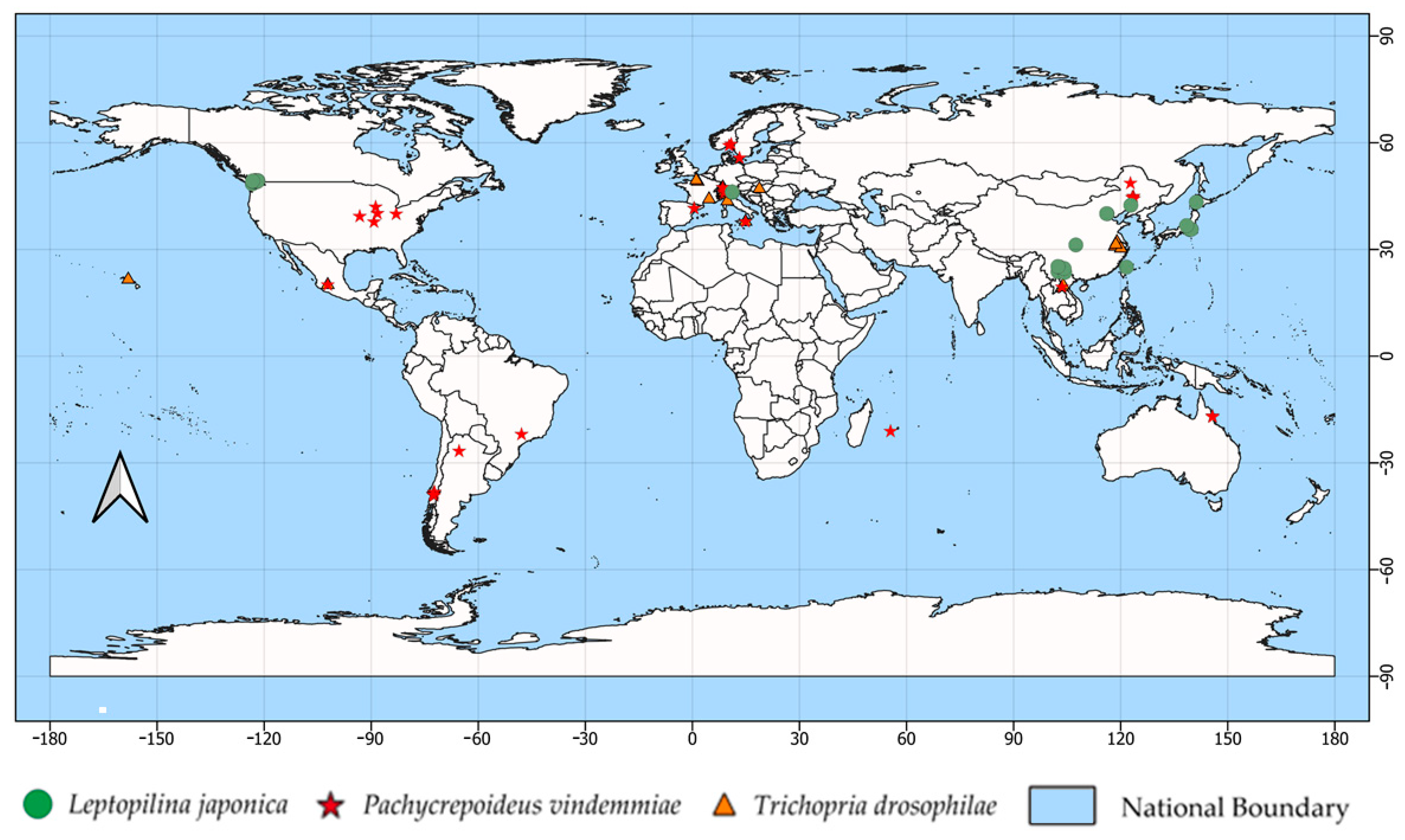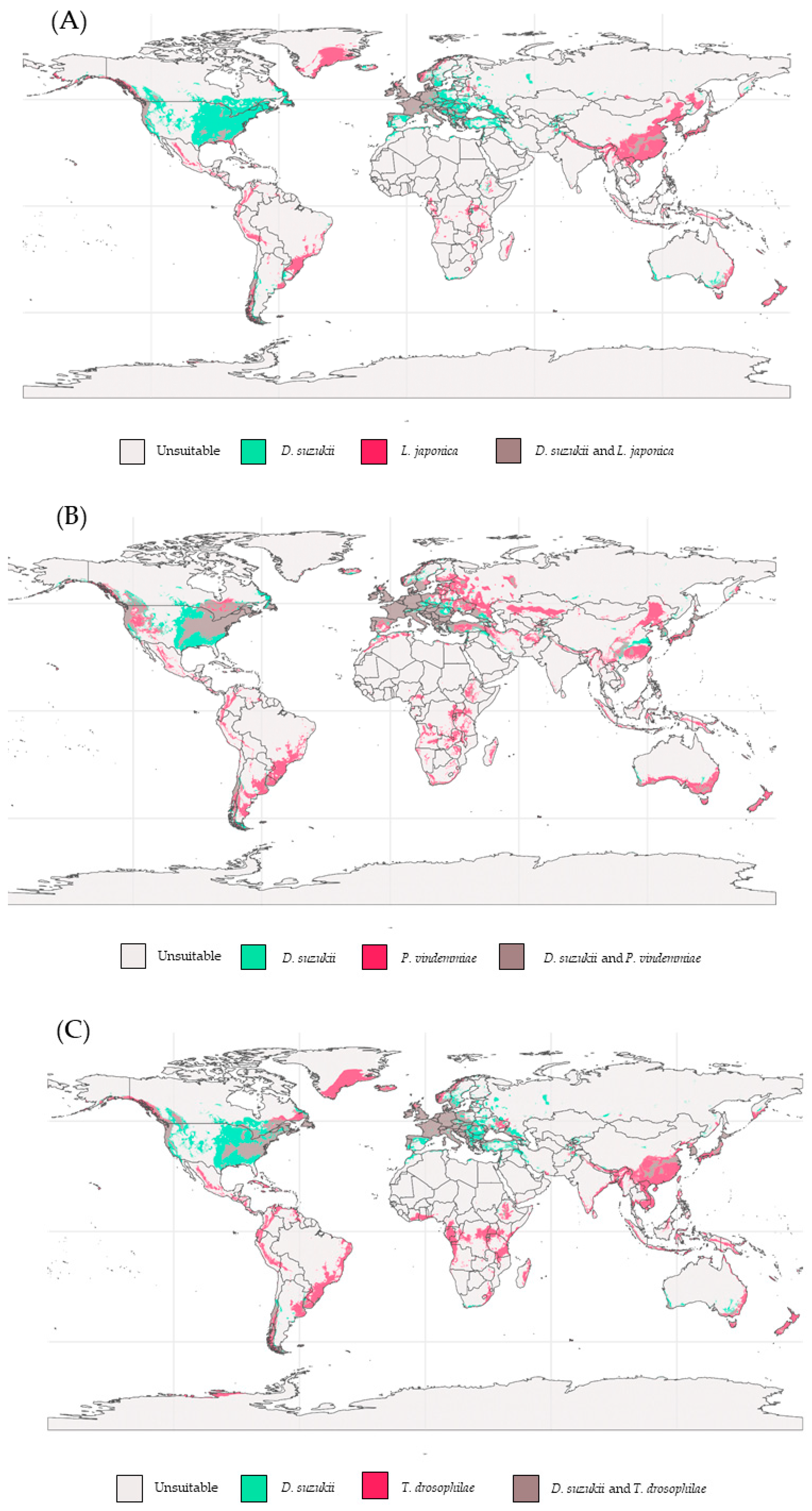 Abeijon LM, Gómez-Llano JH, Ovruski SM, Garcia FRM. Global Distribution of Three Parasitoids of Drosophila suzukii (Diptera, Drosophilidae): Present and Future Climate Change Scenarios. Insects. 2026; 17(1):12. https://doi.org/10.3390/insects17010012