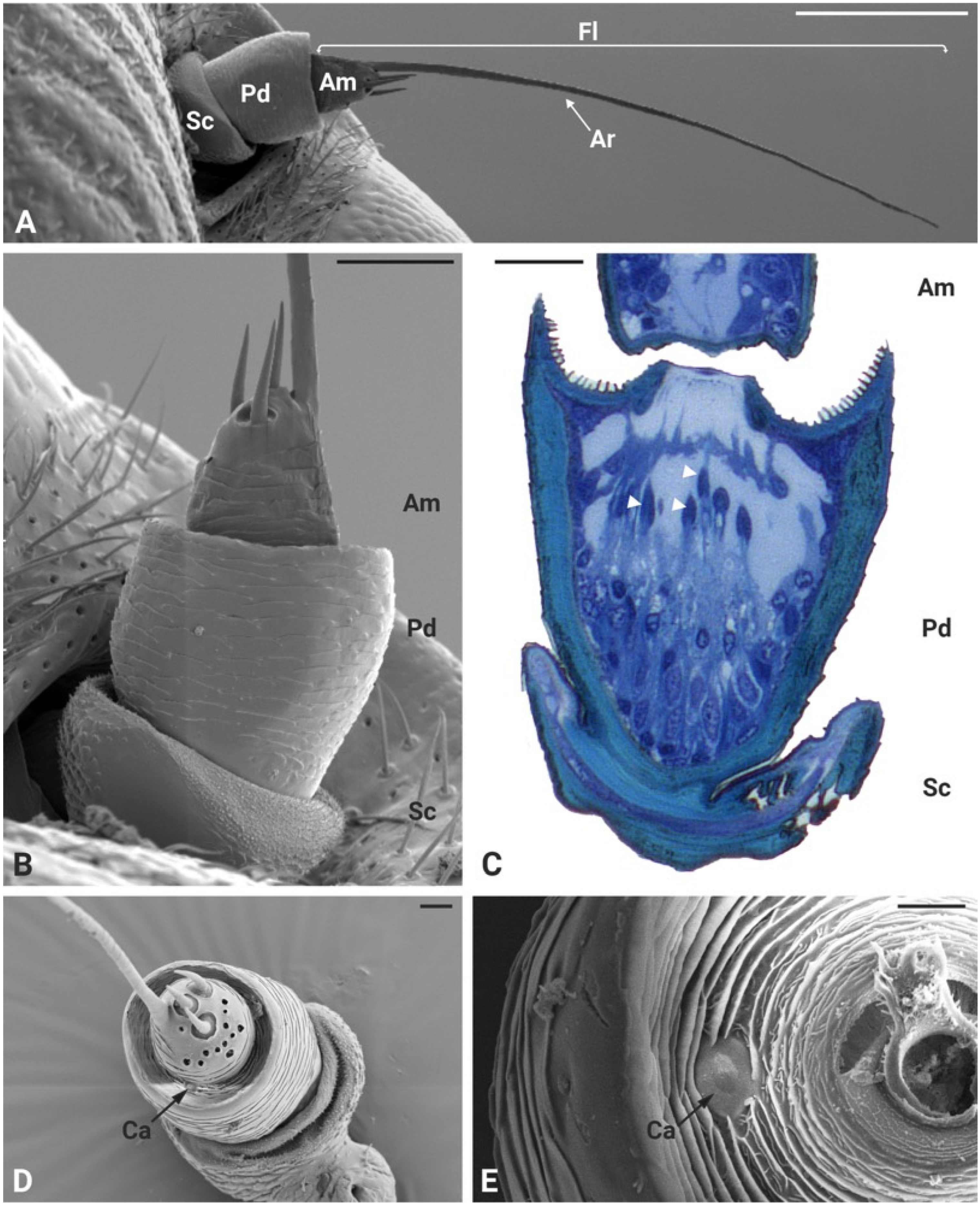 - Rossi Stacconi, M.V.; Romani, R. The Johnston’s Organ of Three Homopteran Species: A Comparative Ultrastructural Study. Arthropod Struct. Dev. 2013, 42, 219–228. [Google Scholar] [CrossRef]