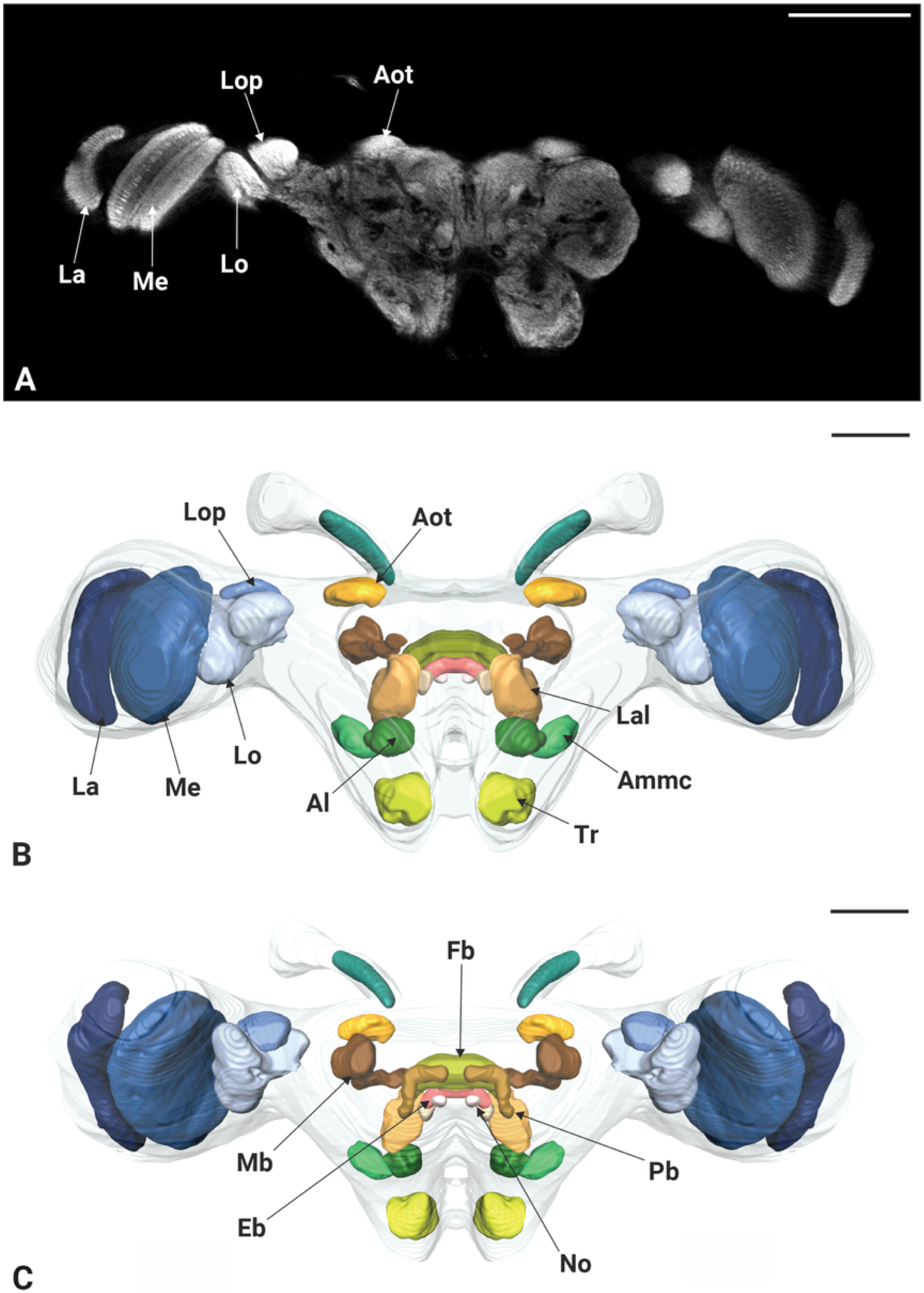 - Xie, G.Y.; Ma, B.W.; Liu, X.L.; Chang, Y.J.; Chen, W.B.; Li, G.P.; Feng, H.Q.; Zhang, Y.J.; Berg, B.G.; Zhao, X.C. Brain Organization of Apolygus lucorum: A Hemipteran Species with Prominent Antennal Lobes. Front. Neuroanat. 2019, 13, 70. [Google Scholar] [CrossRef]