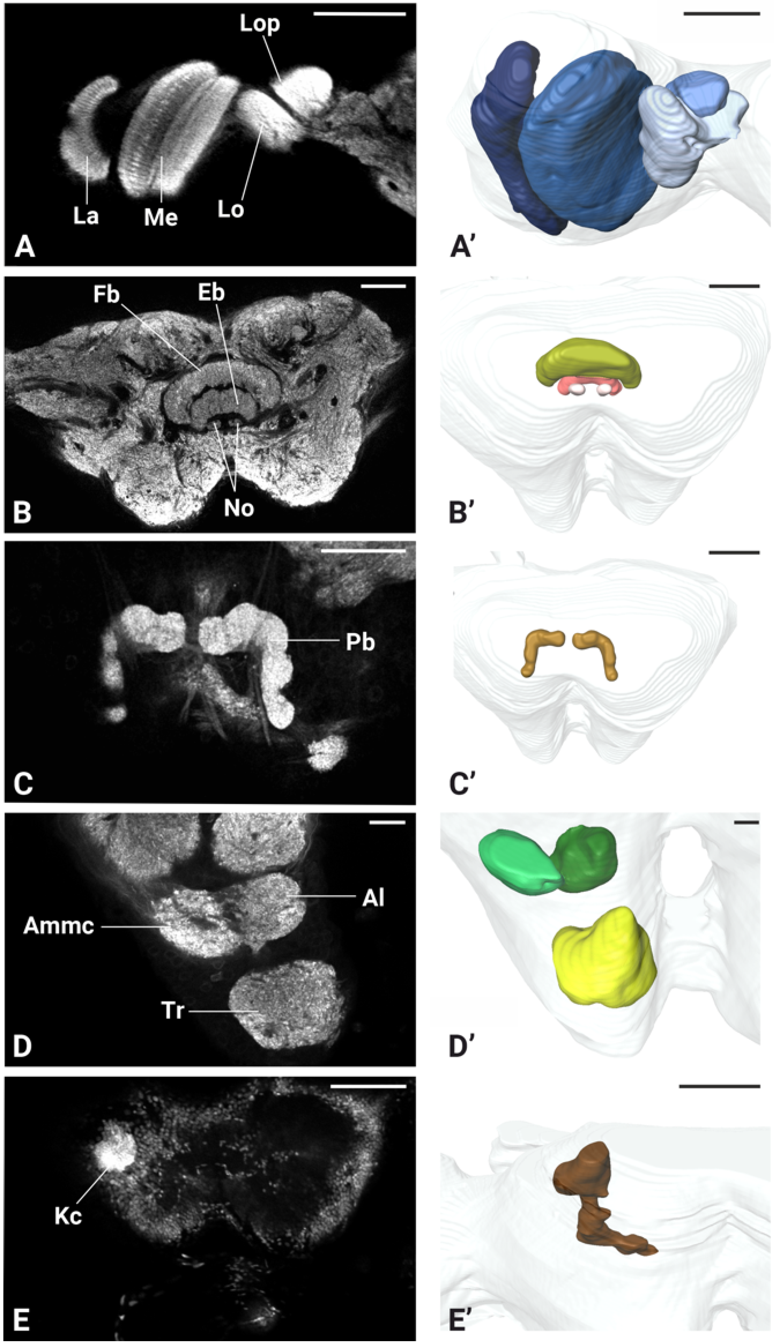 - Groothuis, J.; Pfeiffer, K.; el Jundi, B.; Smid, H.M. The Jewel Wasp Standard Brain: Average Shape Atlas and Morphology of the Female Nasonia vitripennis Brain. Arthropod Struct. Dev. 2019, 51, 41–51. [Google Scholar] [CrossRef]