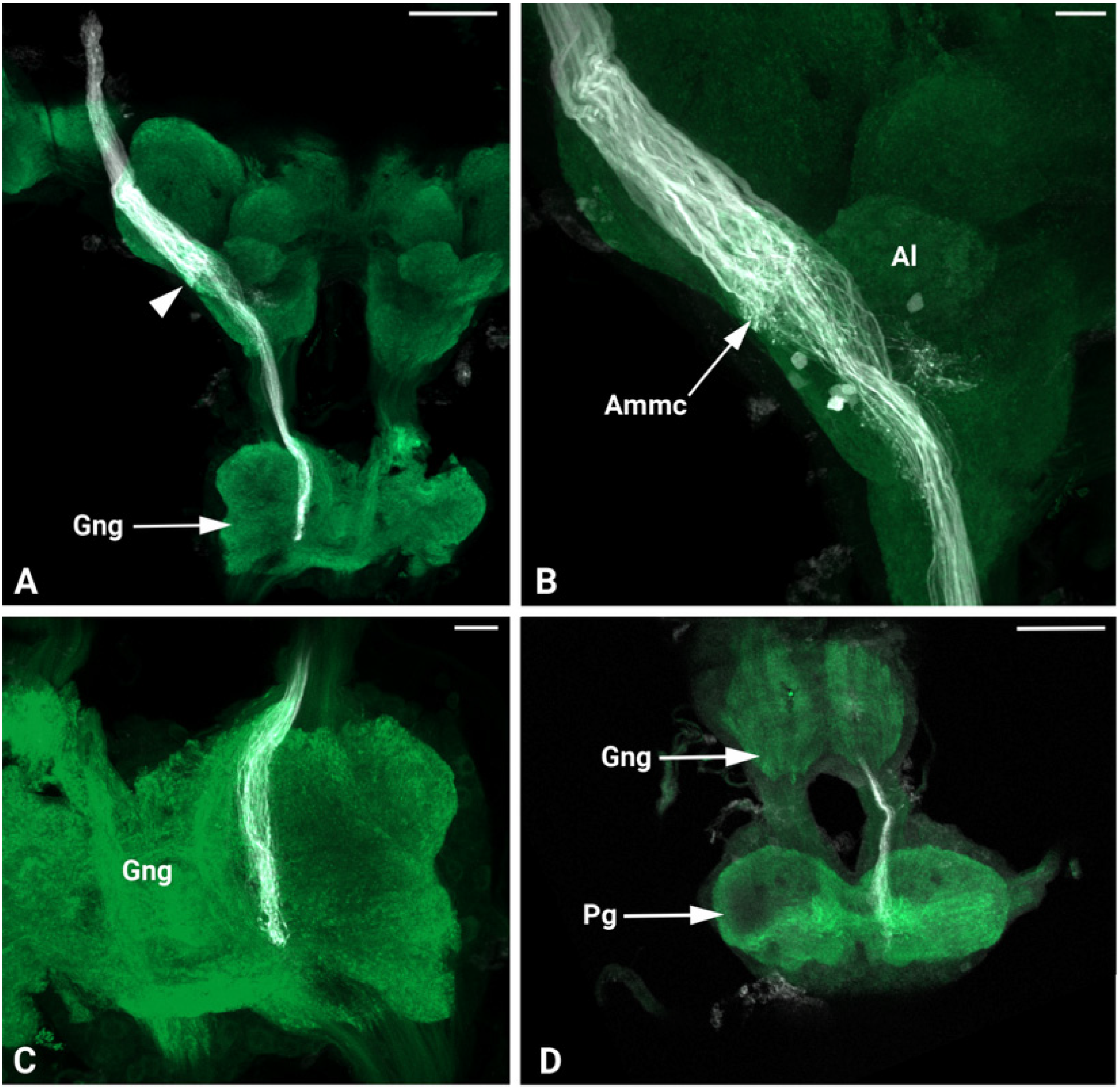 - Ma, B.W.; Zhao, X.C.; Berg, B.G.; Xie, G.Y.; Tang, Q.B.; Wang, G.R. Central Projections of Antennal and Labial Palp Sensory Neurons in the Migratory Armyworm Mythimna Separata. Front. Cell Neurosci. 2017, 11, 370. [Google Scholar] [CrossRef]
