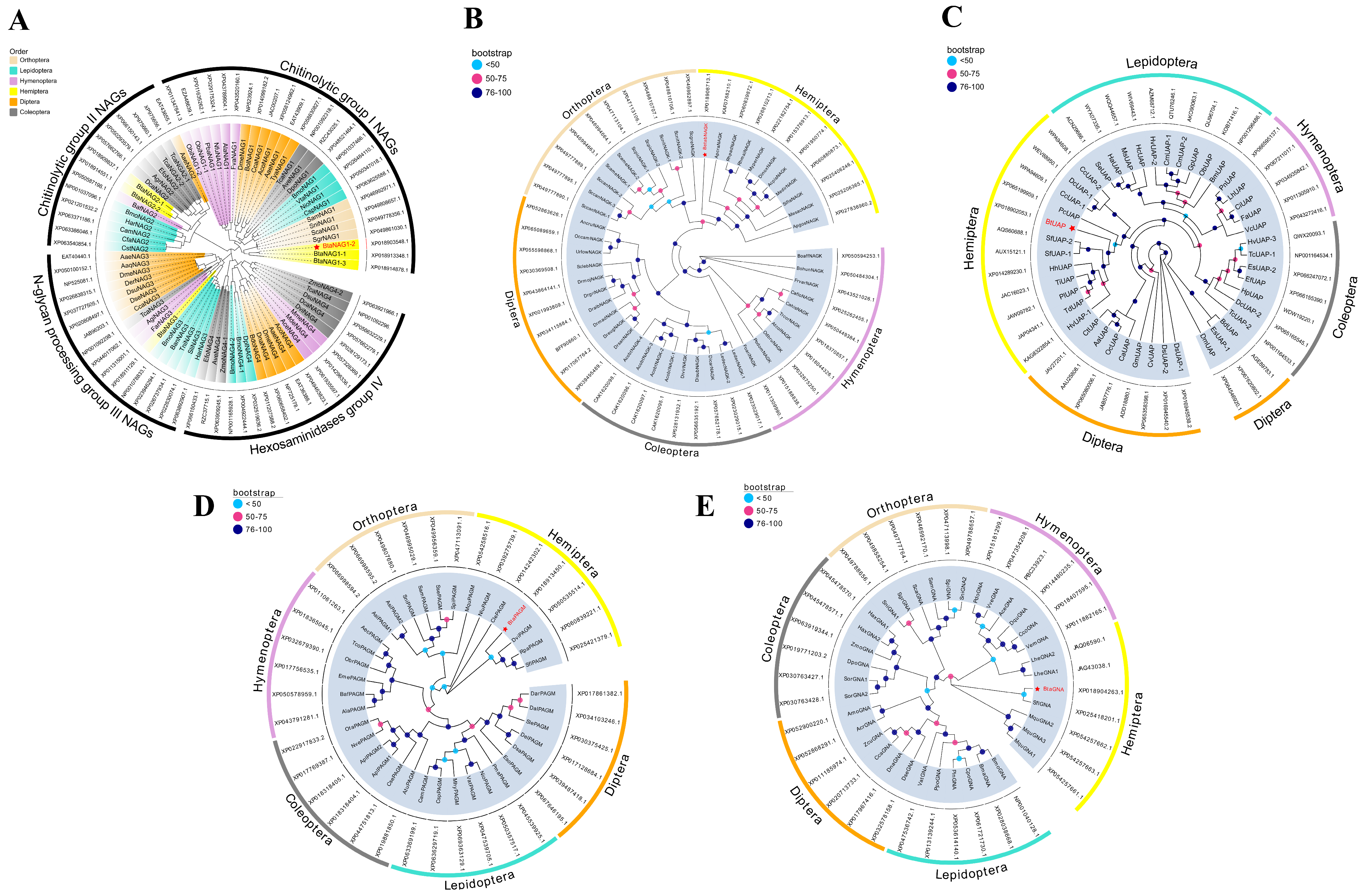 | BtNAG1 | XM019048003 | 622 | 5.62 | lysosome | + | - | GH20 |
