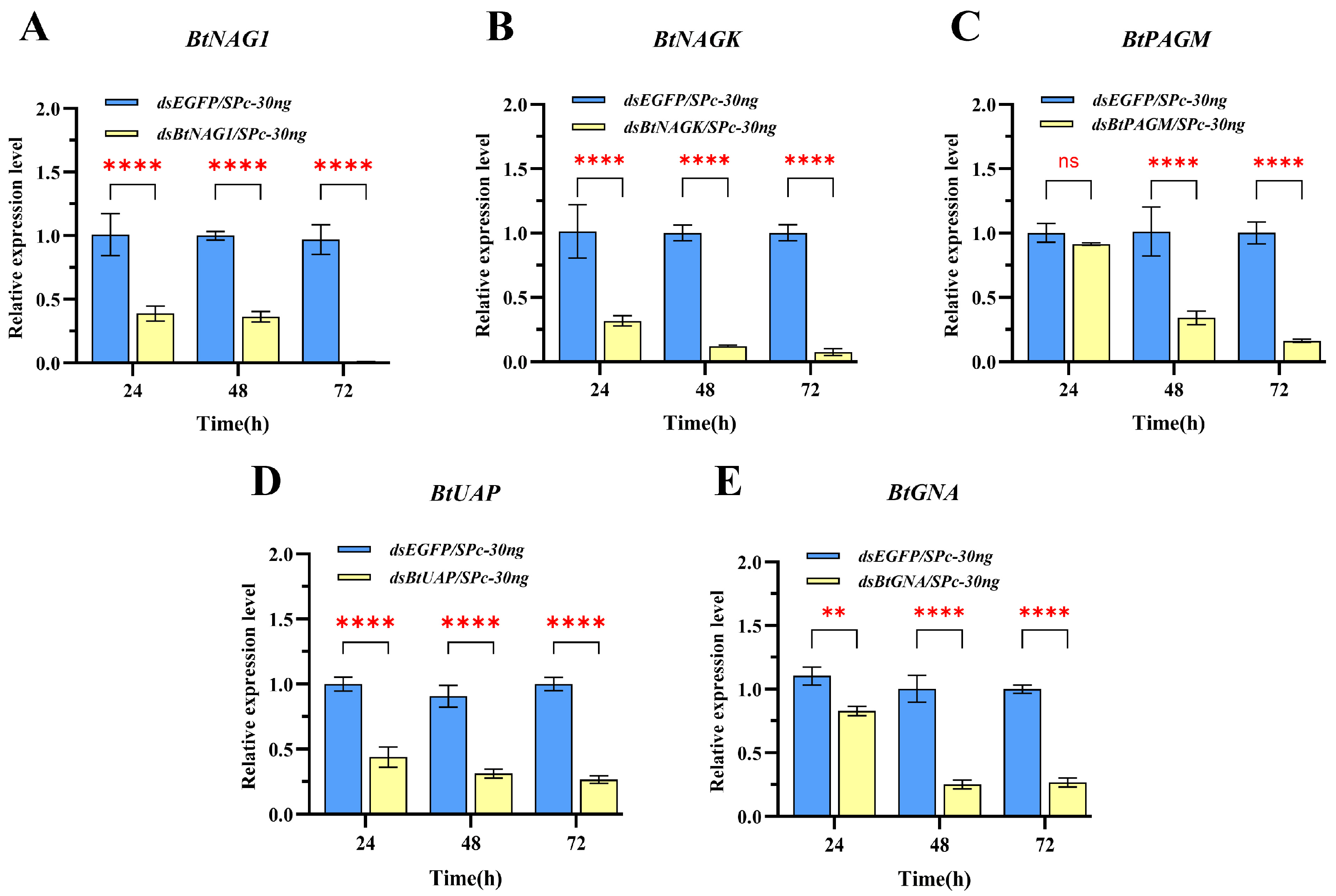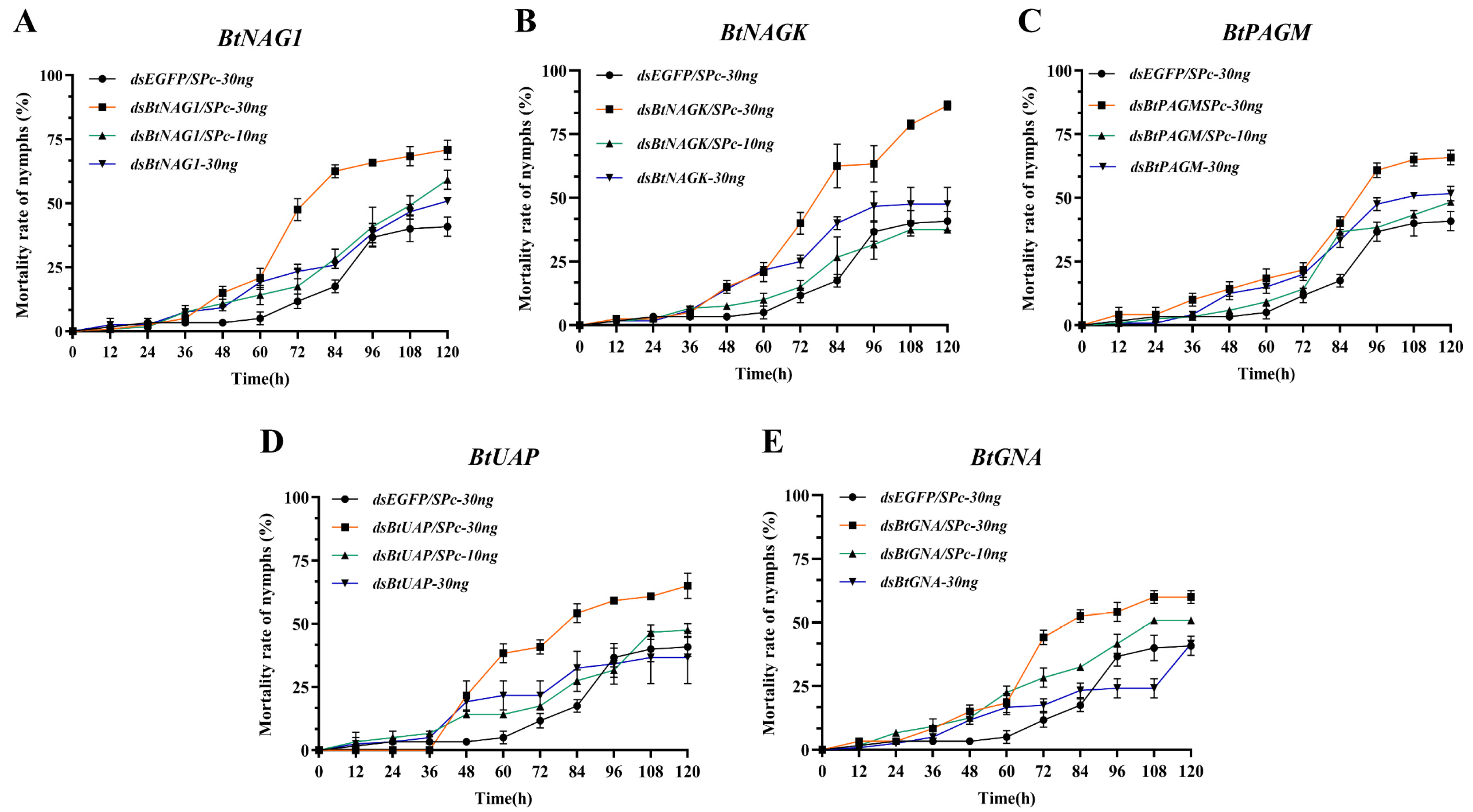 - Lyu, Z.H.; Chen, J.X.; Lyu, J.; Guo, P.P.; Liu, J.H.; Liu, J.H.; Zhang, W.Q. Spraying double-stranded RNA targets UDP-N-acetylglucosamine pyrophosphorylase in the control of Nilaparvata lugens. Int. J. Biol. Macromol. 2024, 271, 132455. [Google Scholar] [CrossRef]