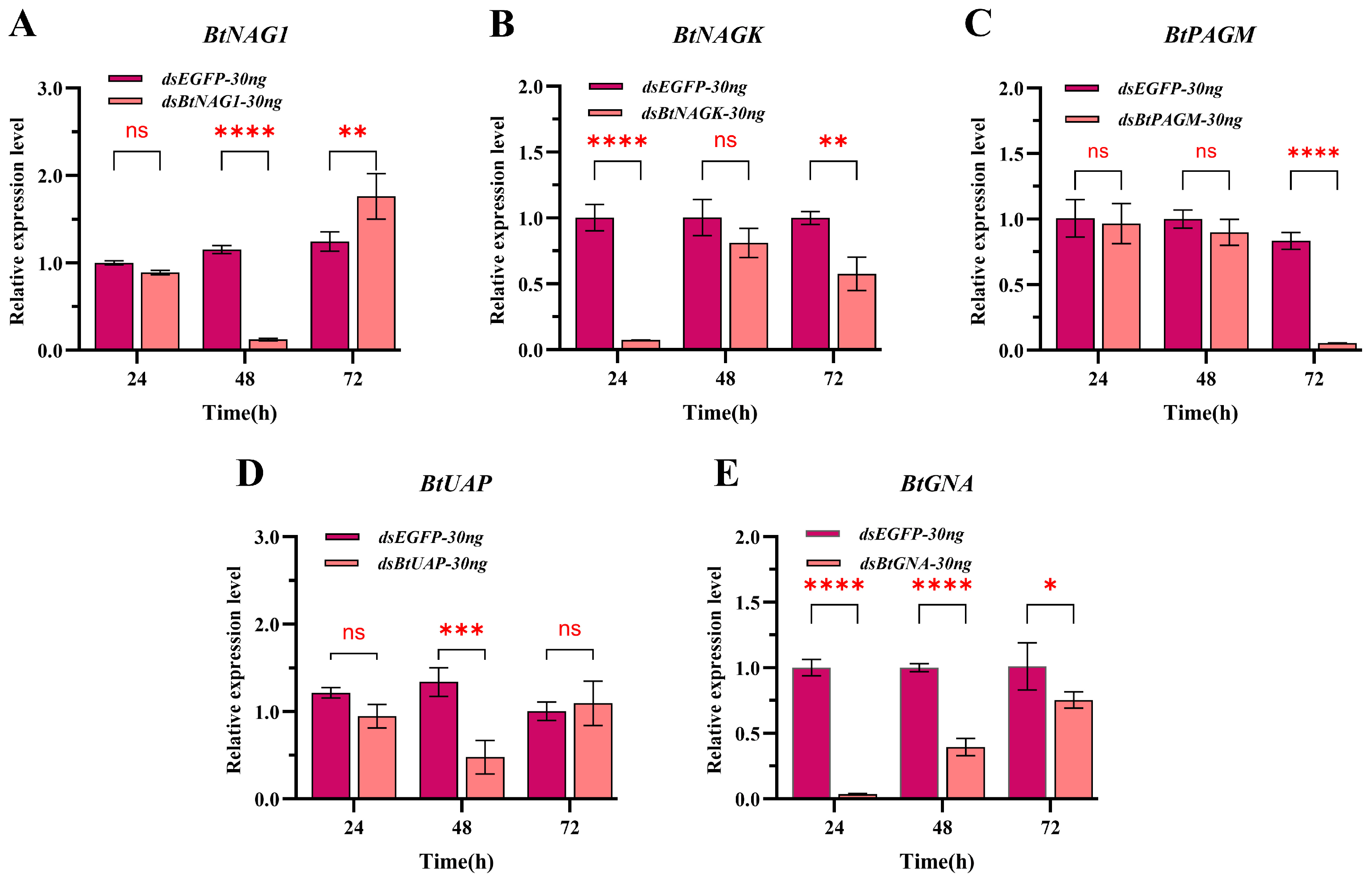 Chicago/Turabian StyleKong, Dejun, Huarong Gu, Yinglu Gao, Yangnan Hou, and Jigang Li. 2026. "Nanomaterial-Mediated RNAi Targeting Chitin Metabolism Genes in MEAM1 Cryptic Species of Bemisia tabaci (Hemiptera: Aleyrodidae)" Insects 17, no. 1: 2. https://doi.org/10.3390/insects17010002