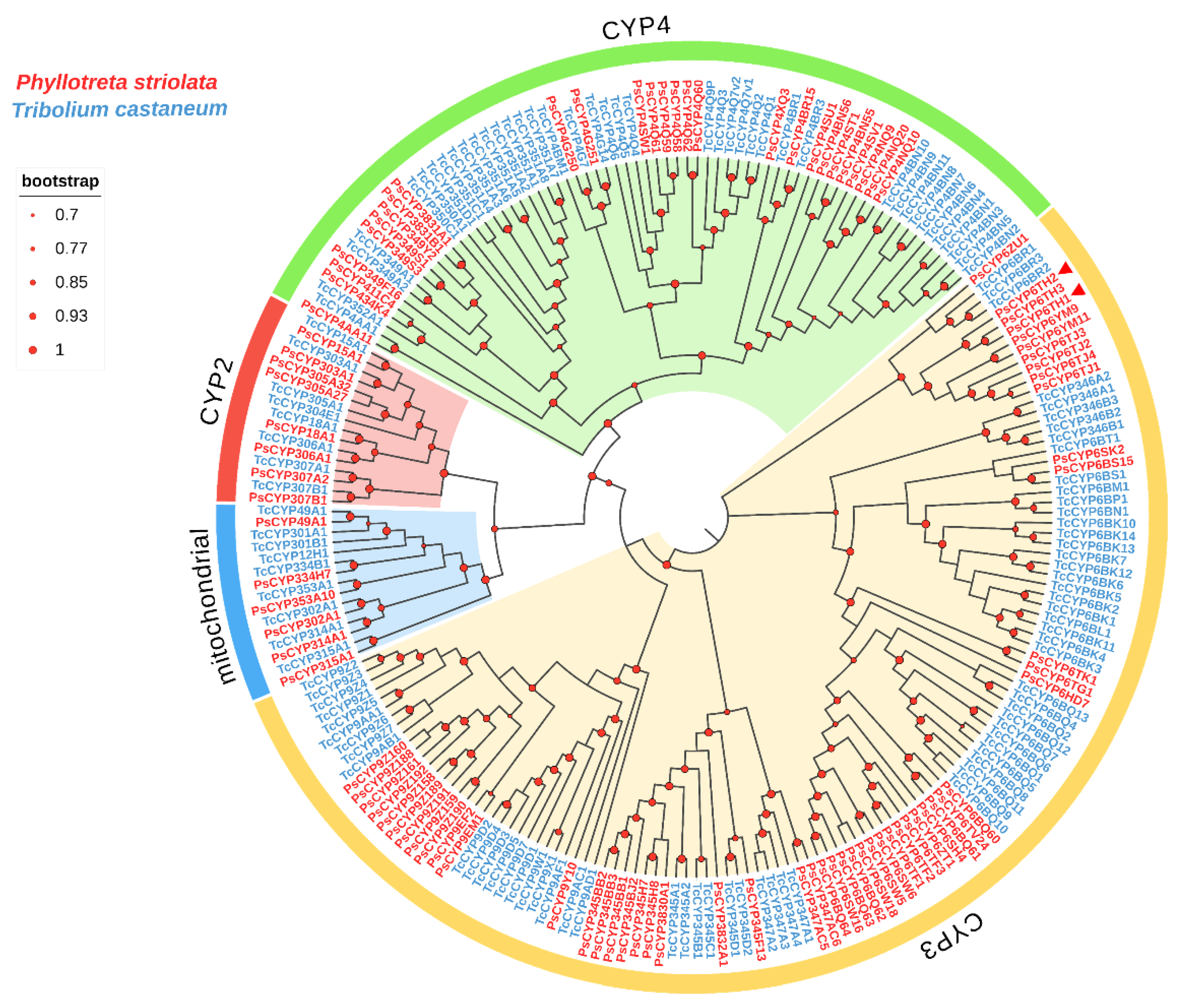 - Wang, Y.Q.; Li, G.Y.; Li, L.; Song, Q.S.; Stanley, D.; Wei, S.J.; Zhu, J.Y. Genome-wide and expression-profiling analyses of the cytochrome P450 genes in Tenebrionidea. Arch. Insect Biochem. Physiol. 2022, 111, e21954. [Google Scholar] [CrossRef]