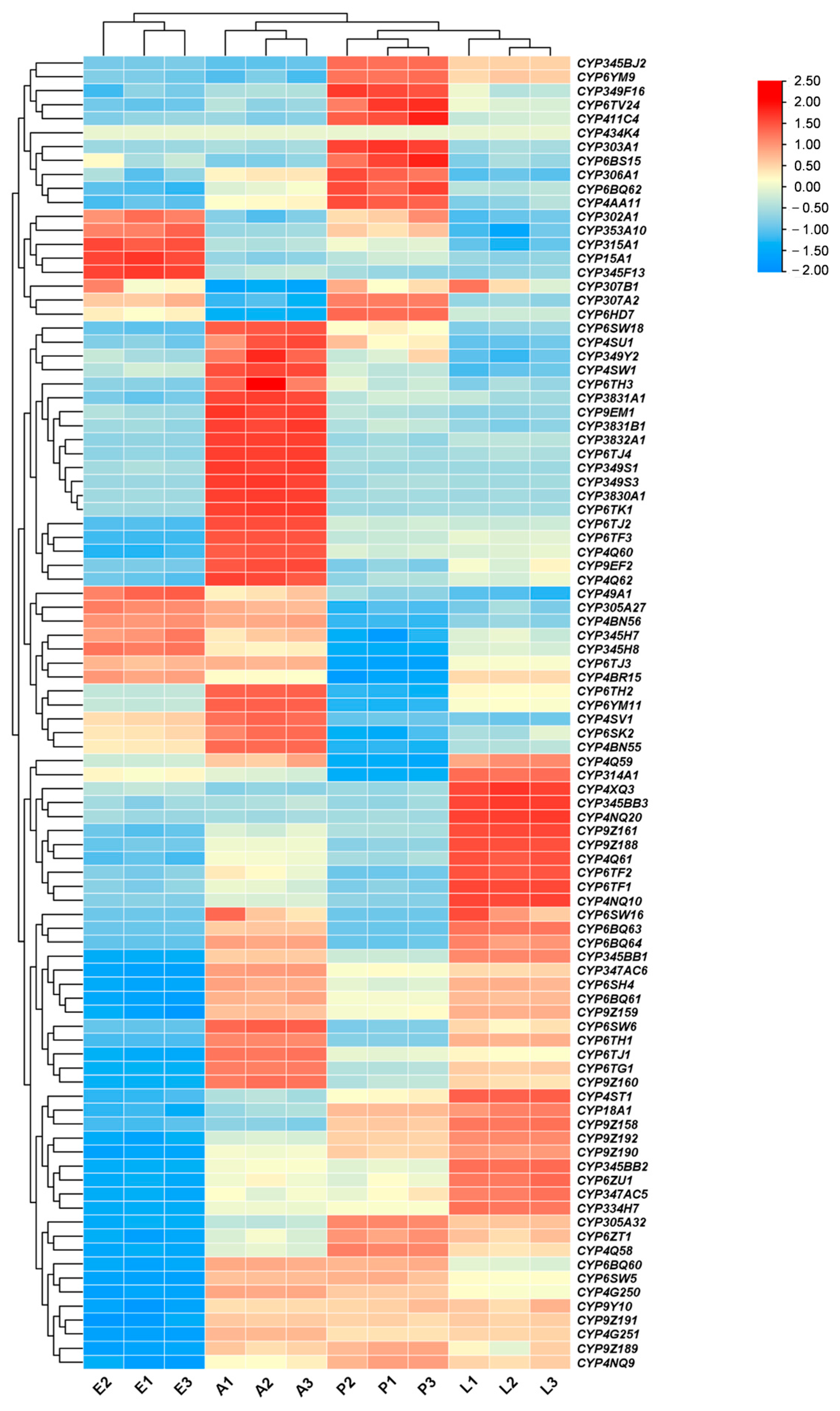 2.6. P450 Gene Identification, Phylogeny, and Expression Profiling