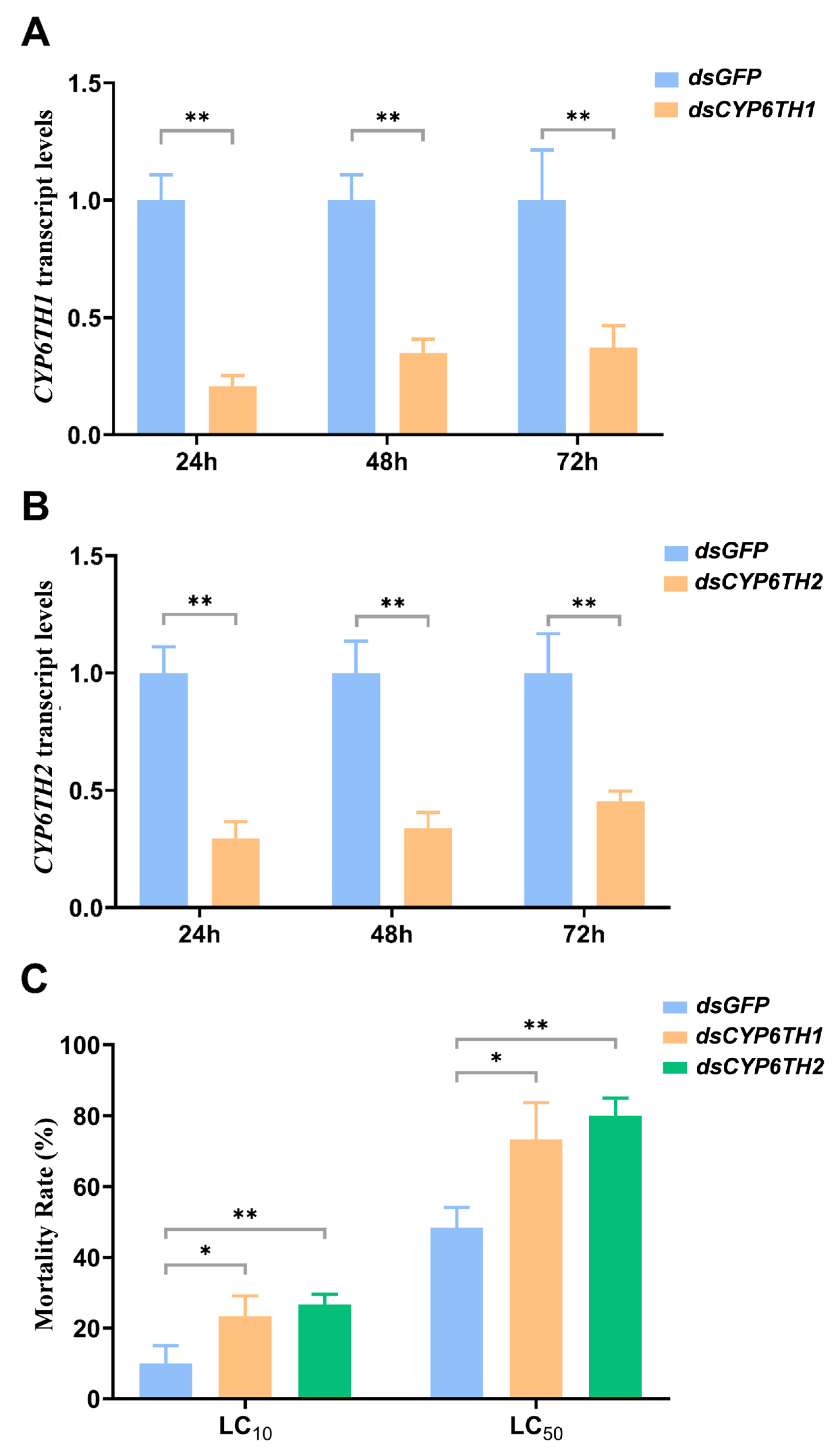 3.4. Knockdown of CYP6TH1 and CYP6TH2 Reduces Survival of P. striolata to Pyridaben Treatments