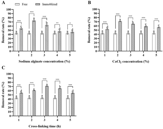 Three independent variables, namely the concentration of sodium alginate and CaCl2 and cross-linking time of calcium alginate, were adopted to optimize the conditions for immobilizing Microbacterium sp. The experimental design involved changing one independent variable at a time while keeping others at a fixed level, and the fixed variables were 3% sodium alginate, 3% CaCl2, and cross-linking for 3 h, which were claimed as the optimal conditions for the formation of sodium alginate–chitosan gel microspheres [24]. The levels of each variable were as follows: sodium alginate concentration, 1%, 2%, 3%, 4%, and 5%; CaCl2 concentration, 1%, 2%, 3%, 4%, and 5%; and cross-linking time, 1, 2, 3, 4, and 5 h [25]. After optimal level ranges of each variable were preliminarily determined, the orthogonal L9(33) test on three levels of these three variables (Table 2) was further used to optimize the immobilization conditions.