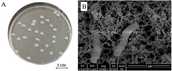 Morphology (A) and microscopic structure (B) of Microbacterium sp. immobilized in calcium alginate microspheres.