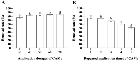 To evaluate the optimal application dosage of the CAMs to remove deltamethrin, 30, 40, 50, 60, and 70 Microbacterium sp.-containing CAMs were inoculated in 100 mL of MS media supplemented with 200 μg/mL deltamethrin at 175 rpm, 25 °C for 48 h. To assess the reusability of the CAMs to remove deltamethrin, 40 Microbacterium sp.-containing CAMs were inoculated in 100 mL of MS media supplemented with 200 μg/mL deltamethrin at 175 rpm, 25 °C for 48 h, then the CAMs were filtered out and washed with deionized water, and then inoculated in new deltamethrin-containing MS media at 175 rpm, 25 °C for 48 h. This process was repeated four times. The MS media containing deltamethrin only served as a control. After each incubation, the residual deltamethrin in the culture media was quantified, and its removal rate was calculated according to the abovementioned method. Each treatment had five replicates.
