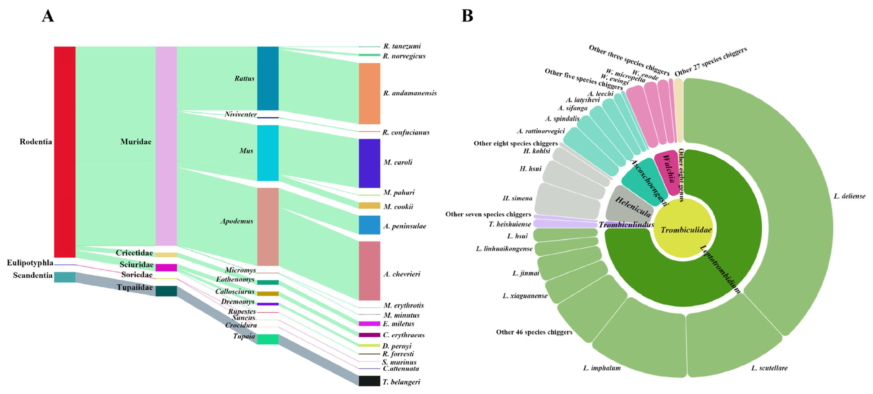 - Guo, Y.; Guo, X.G.; Peng, P.Y.; Lv, Y.; Xiang, R.; Song, W.Y.; Huang, X.B. Infestation and distribution of chiggers on the Anderson’s white-bellied rats in southwest China. Vet. Med. Sci. 2023, 9, 2920–2926. [Google Scholar] [CrossRef]