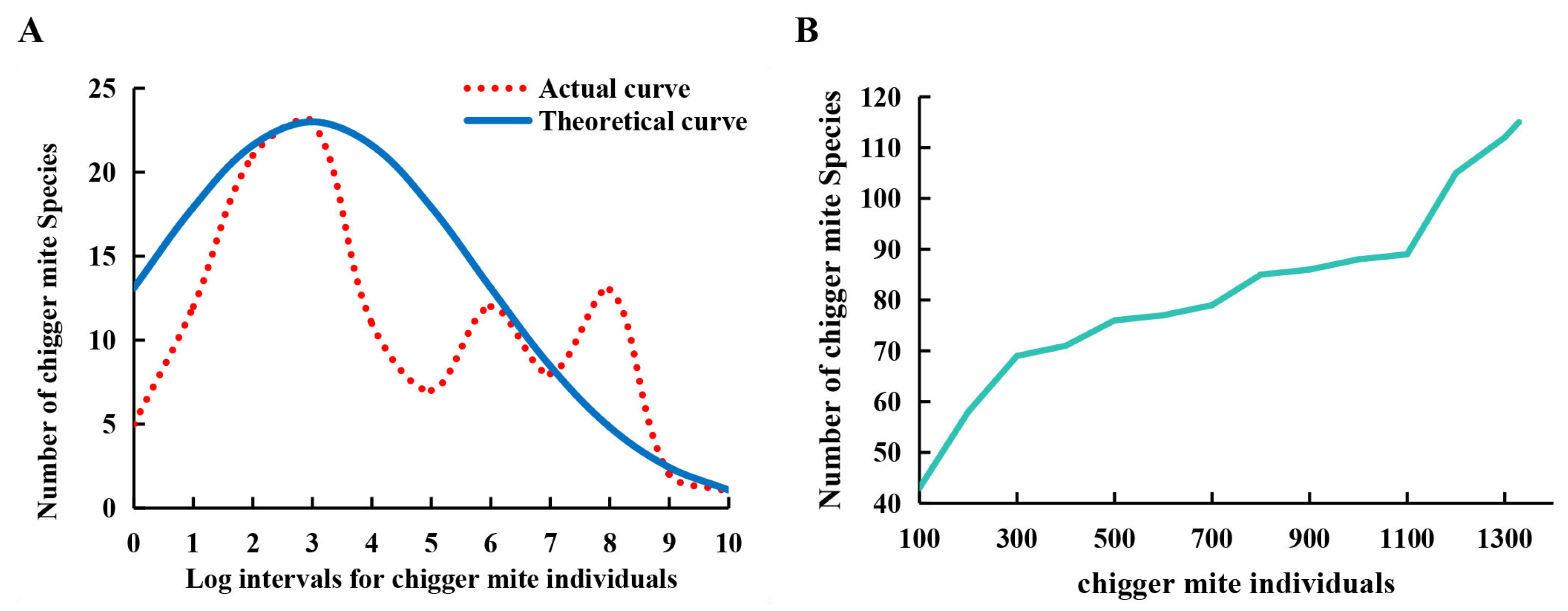 - Guo, Y.; Zhou, J.X.; Guo, X.G.; Song, W.Y.; Zhao, C.F.; Zhang, Z.W.; Fan, R.; Chen, T.; Lv, Y.; Yin, P.W. Species diversity and related ecology of chiggers on small mammals in a unique geographical area of Yunnan Province, southwest China. Exp. Appl. Acarol. 2023, 91, 439–461. [Google Scholar] [CrossRef] [PubMed]