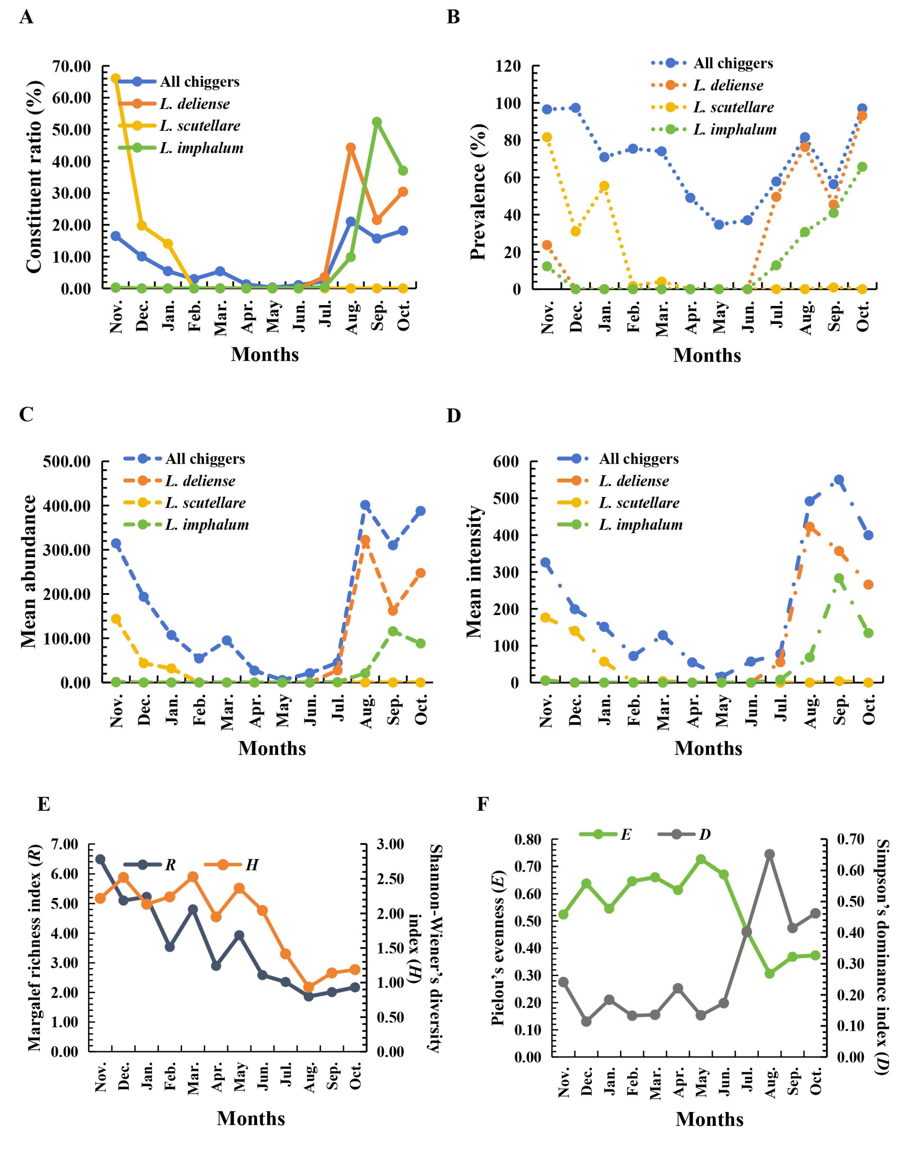 | Months | No. of Hosts | No. and Cr of Chiggers | Infestation Indexes of Chiggers | Indexes of Chigger Community | ||||||||