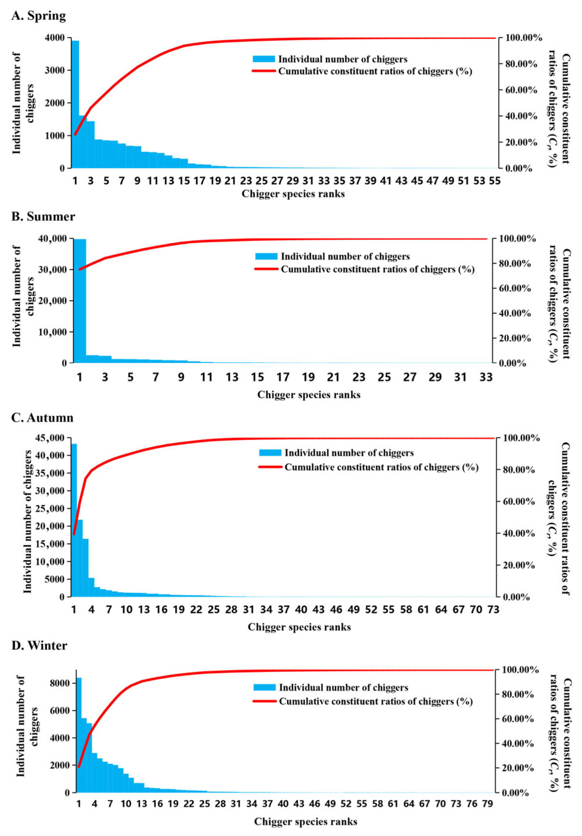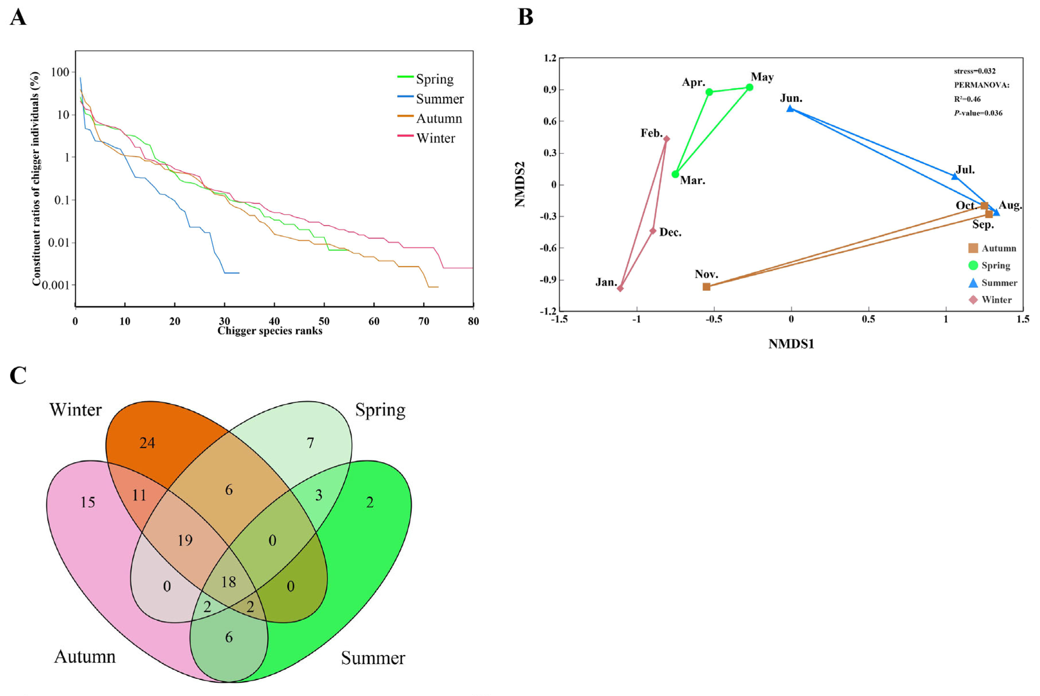 2.7. Analysis on Seasonal Dynamics of Chigger Community