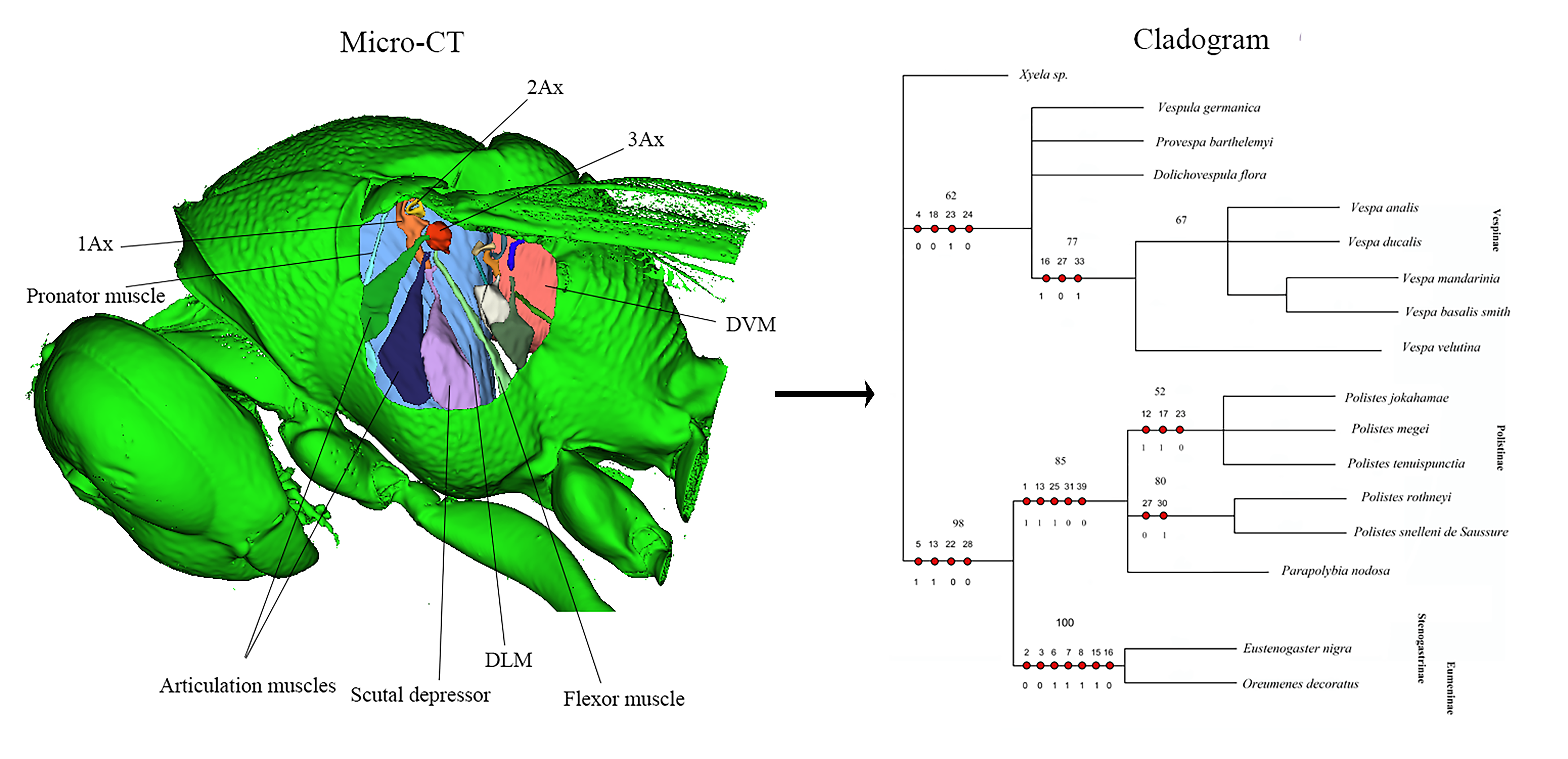This study introduced two models illustrating forewing and hindwing articulation, refining our understanding of Hymenopteran wing base morphology. The present dataset is insufficient to test the monophyly of Vespidae or to clarify the subfamily-level relationship. The absence of a fourth axillary sclerite challenges prior classifications, emphasizing the need for further biomechanical and comparative studies to explore wing adaptations and evolutionary diversification.
