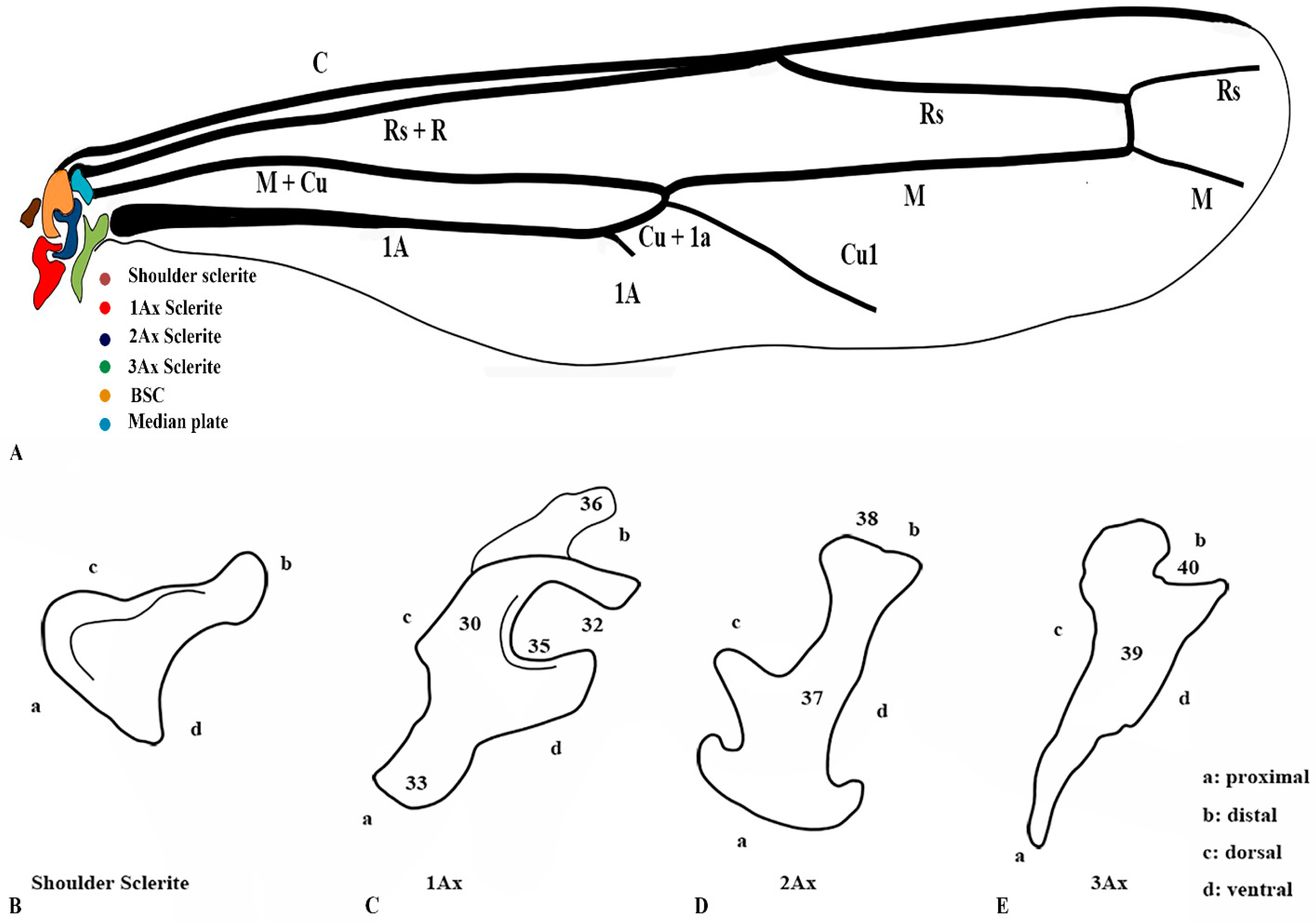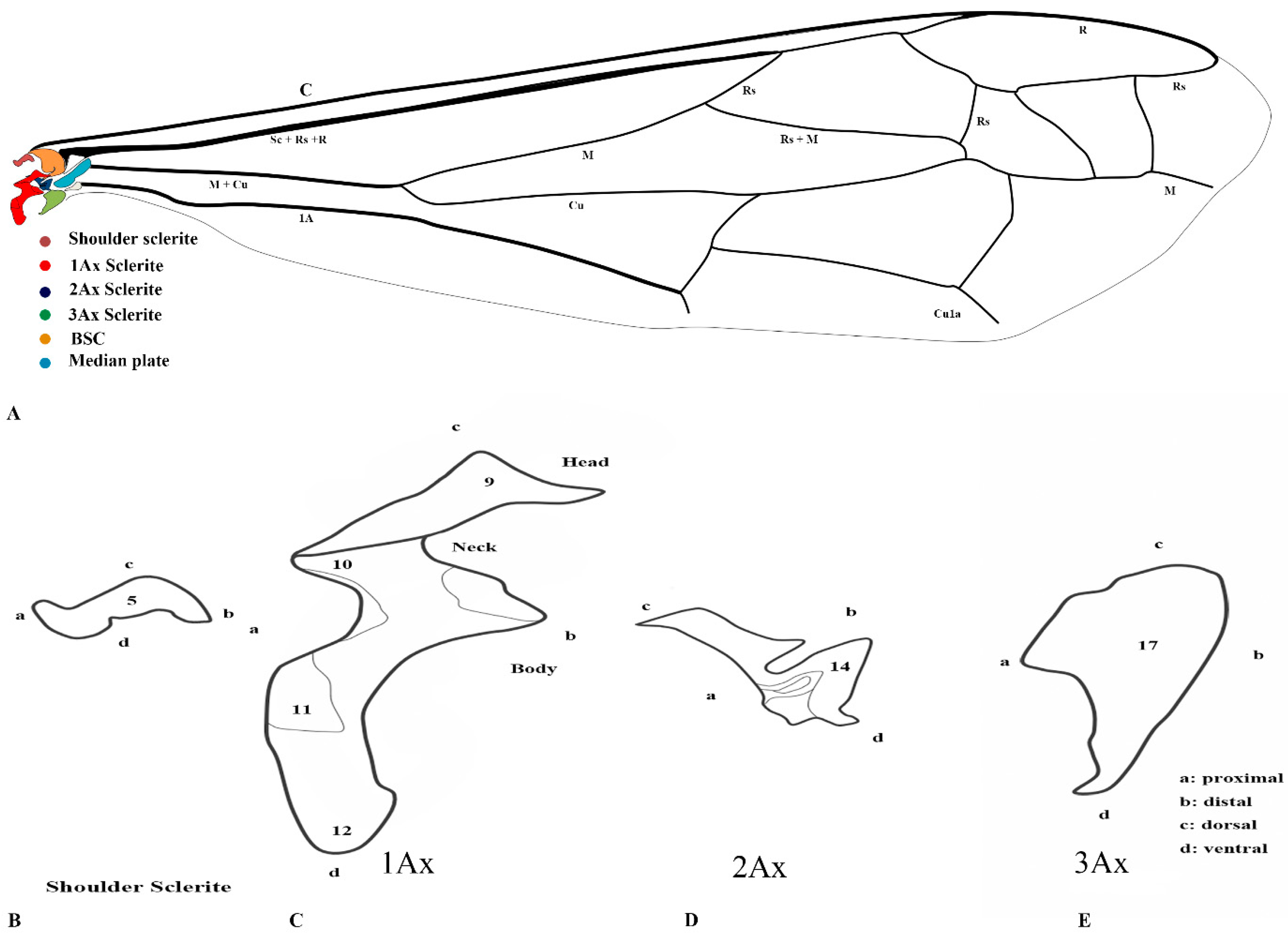 1]. The first axillary sclerite (1Ax) is a longitudinal element that consists of the head, neck, and basal sections. It forms an α angle between its proximal and distal segments [
