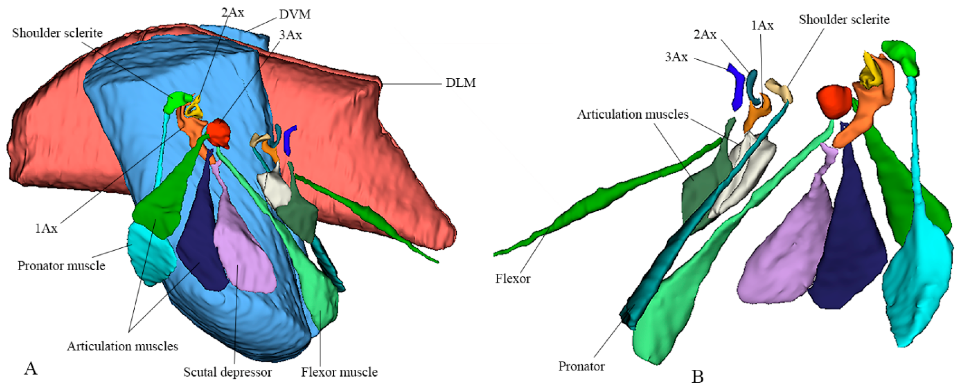 A notable structural variation exists in the musculature: the pronator muscle is singular, whereas the flexor muscle is triplicated. This distinction plays a critical role in wing control. While a single muscle is sufficient for basic expansion and relaxation, the triplicate flexor muscles attached to the third axillary sclerite (3Ax) are essential for fine-tuned steering and modulation of wing vibrations during flight. Their function is reinforced by the connection between the second (2Ax) and third (3Ax) axillary sclerites, as well as morphological variations in the 3Ax and basanale, which further optimize wing maneuverability and stability. The 3D reconstruction is shown in
