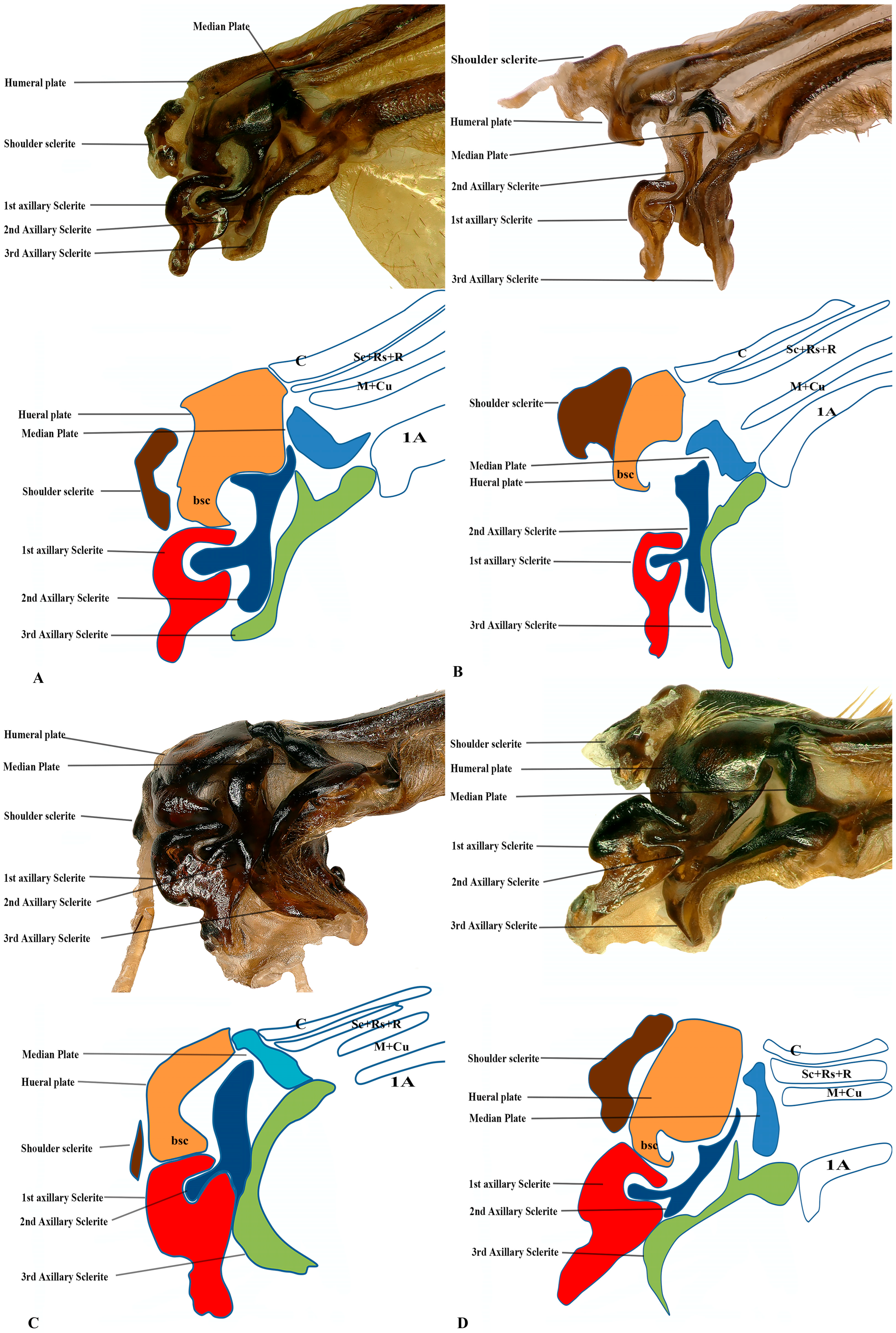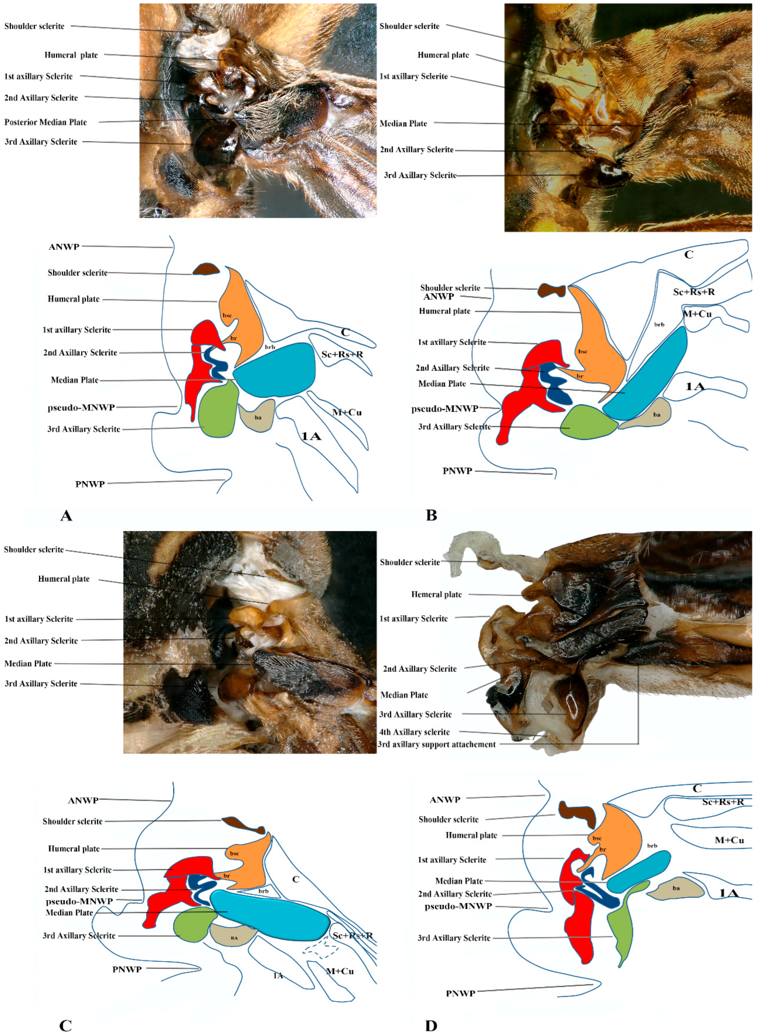 Forewing base articulation sclerites original picture and sketch together; (A) Vespa mandarinia, (B) Vespa velutina, (C) Vespula germanica, (D) Oreumenes decoratus.