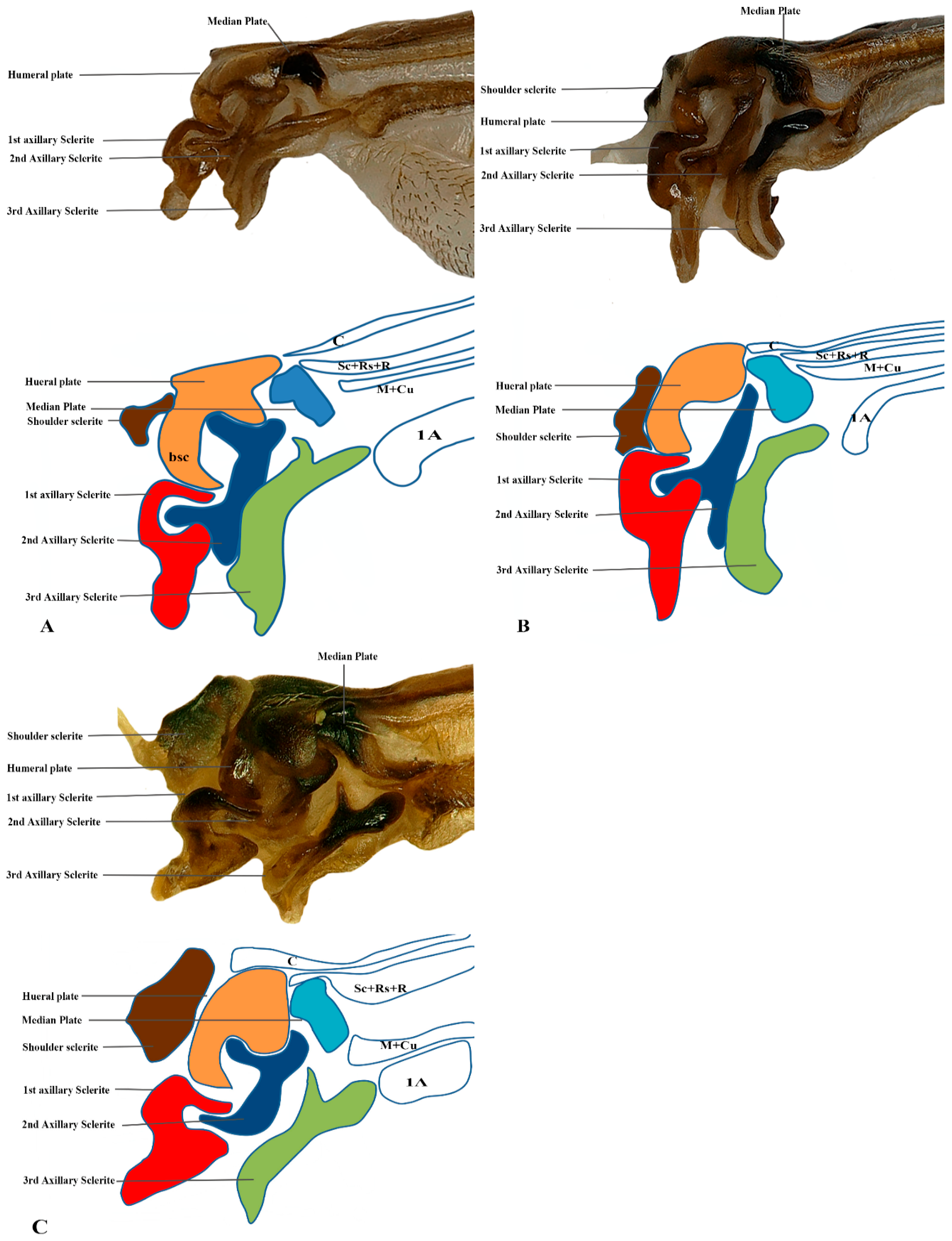 Hindwing base articulation sclerites original picture and sketch together; (A) Parapolybia nodosa, (B) Provespa barthelemyi, (C) Dolichovespula flora.