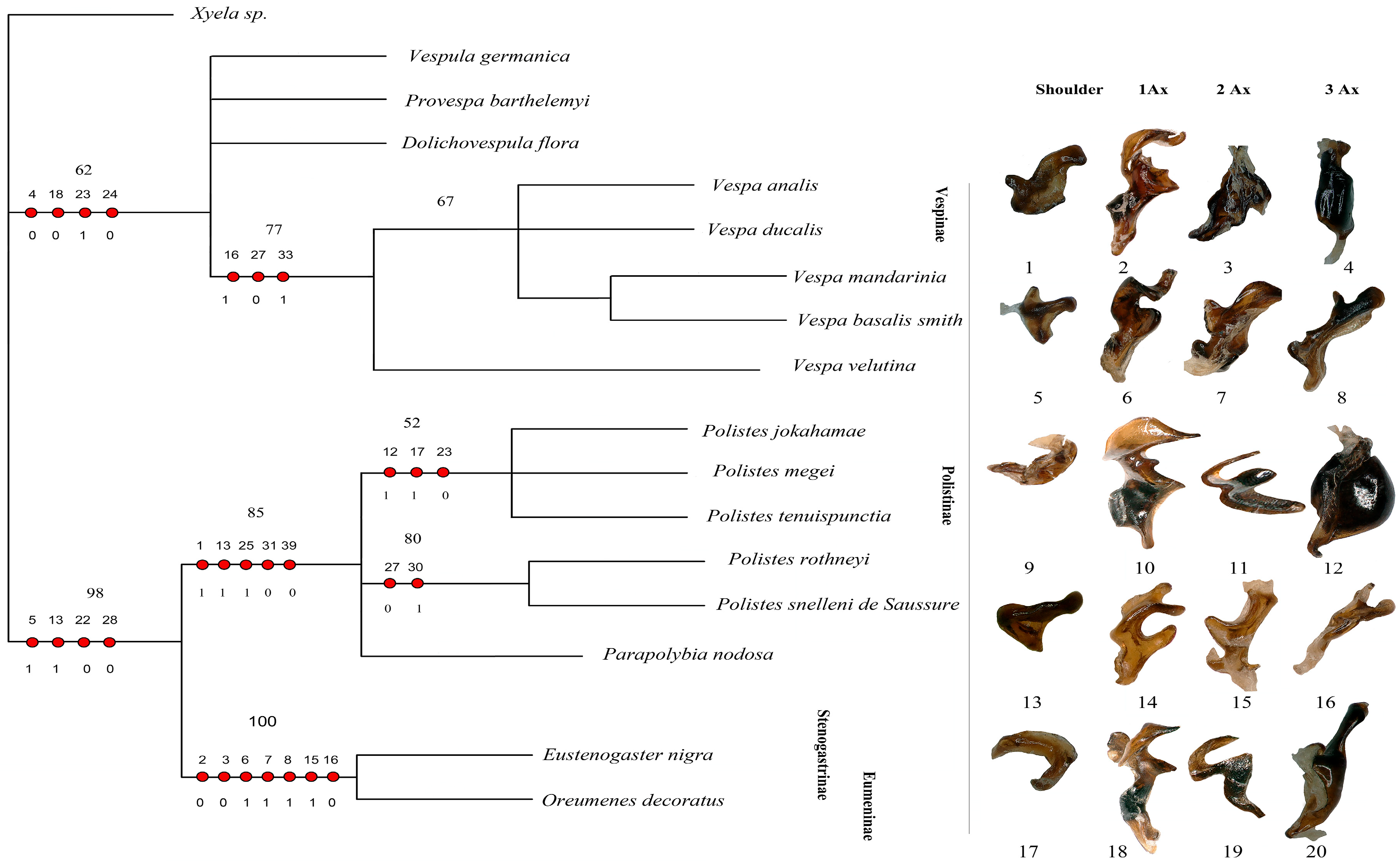 We studied one species from each Eumeninae and Stenogastrinae. While most of the articulation sclerites are the same, we also observed some distinct variations. The surface of the tegula is smooth, slightly concave, and tapered at both ends (Cha: 1). The shape of the first axillary sclerite head is more pointed and curved in