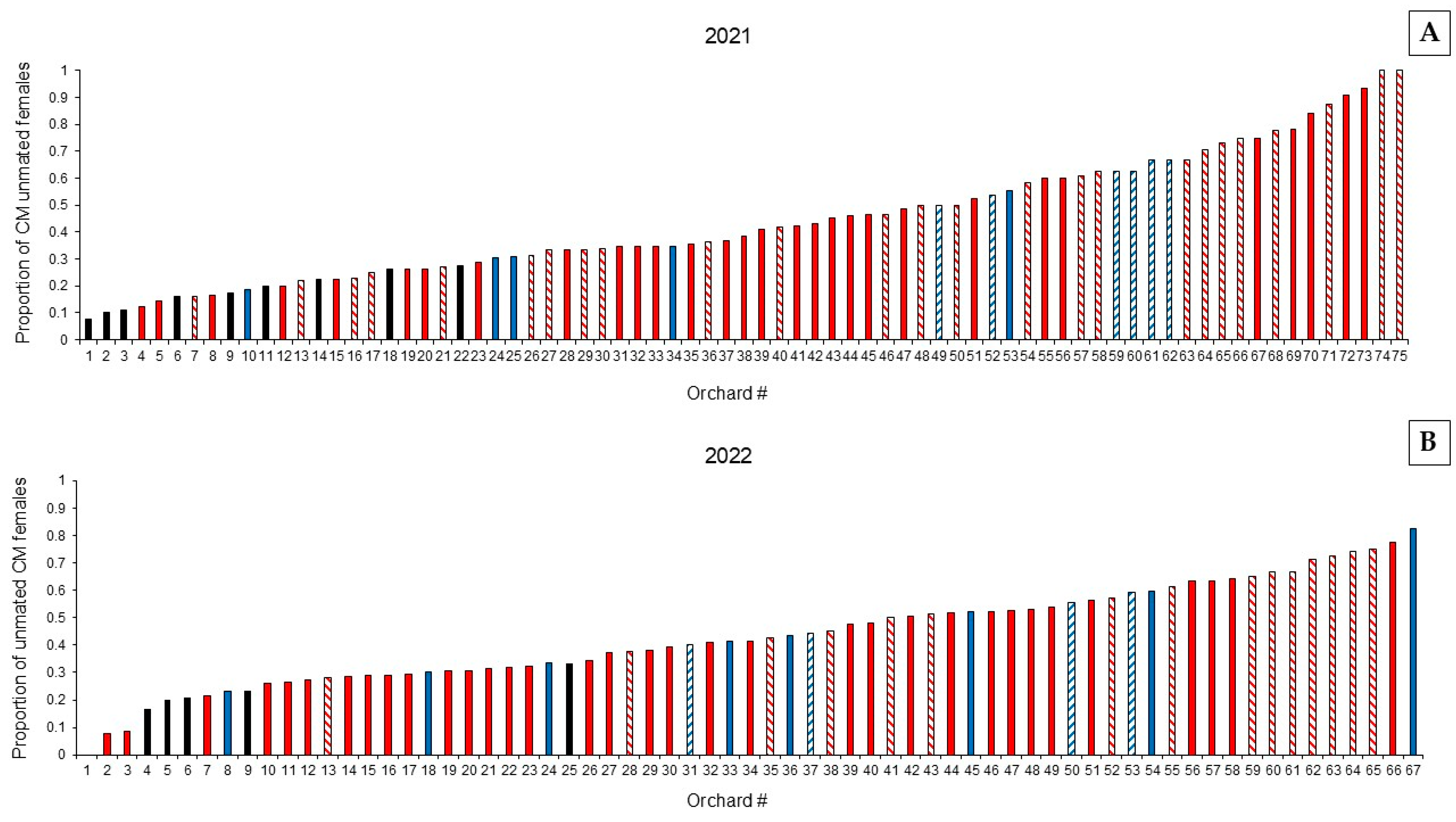 | Year | Treatment, Dispensers ha−1, Management | Number of Orchards | Number of Dissected Females | Mean Values (±SE) a | |
