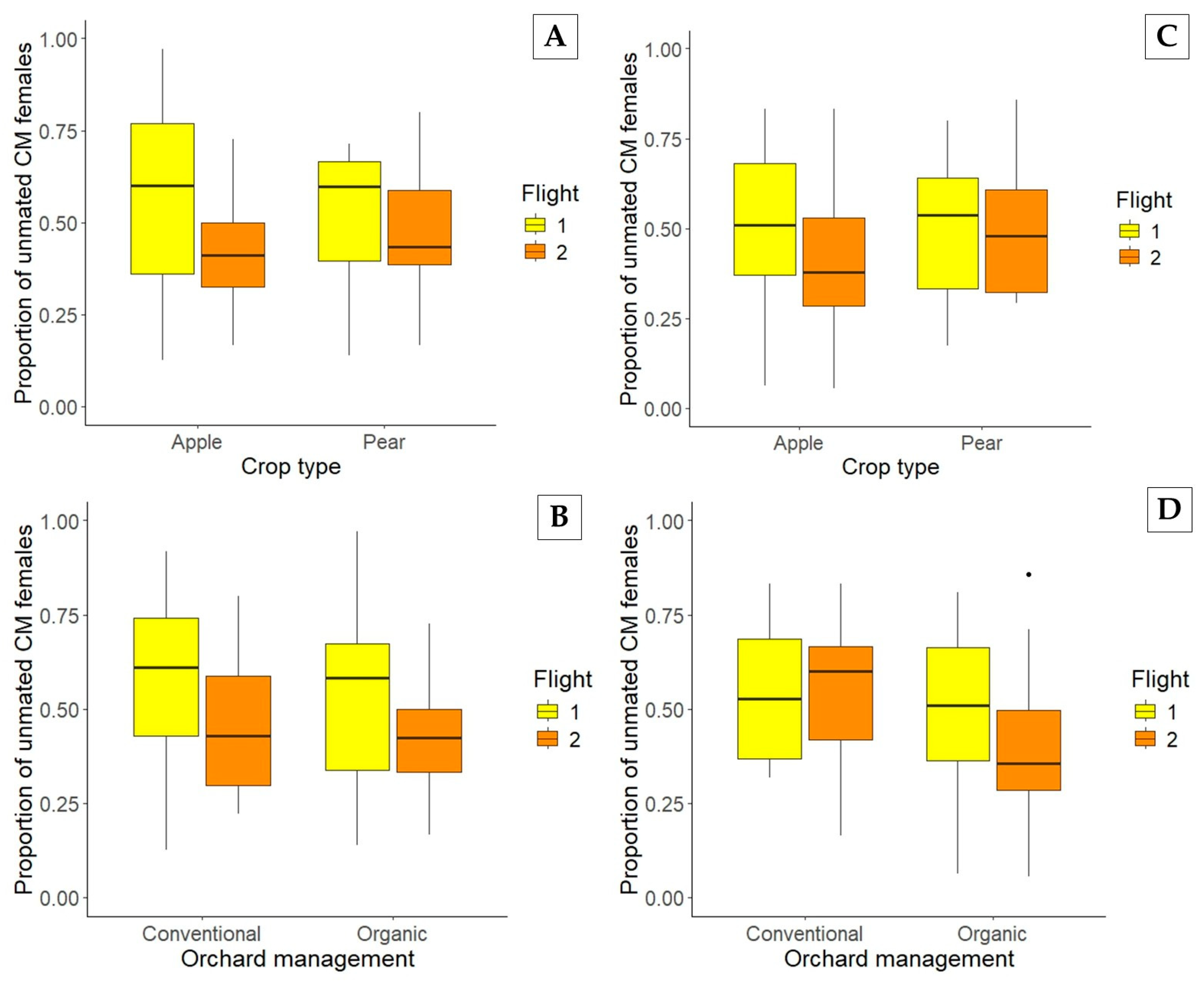- Preti, M.; Knight, A.L.; Mujica, M.V.; Basoalto, E.; Favaro, R.; Angeli, S. Developing female removal for Cydia pomonella (Lepidoptera: Tortricidae) in organic pear in the USA and Italy. J. Appl. Entomol. 2021, 145, 856–868. [Google Scholar] [CrossRef]