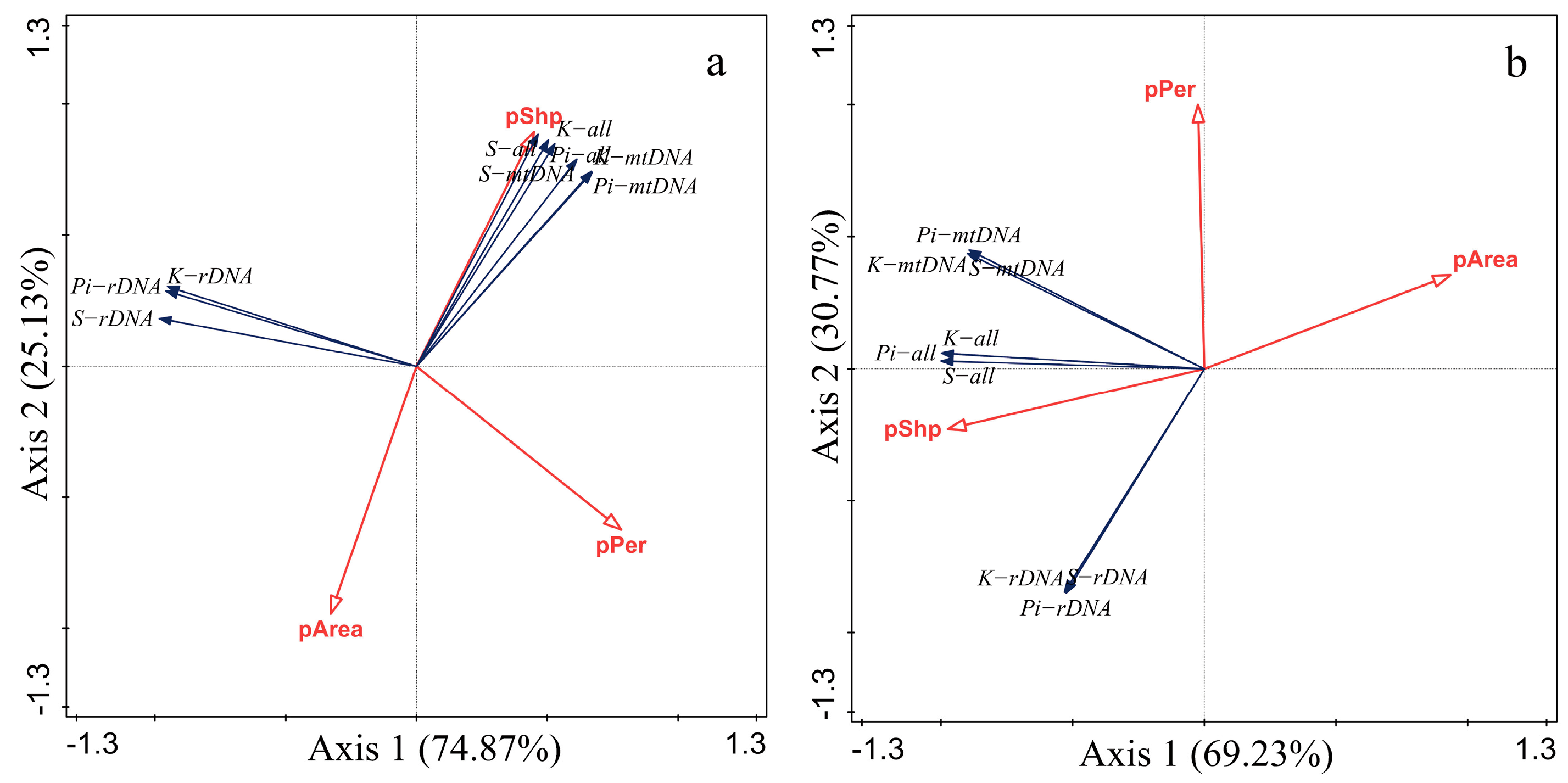 - Librado, P.; Rozas, J. DnaSP v5: A software for comprehensive analysis of DNA polymorphism data. Bioinformatics 2009, 25, 1451–1452. [Google Scholar] [CrossRef]