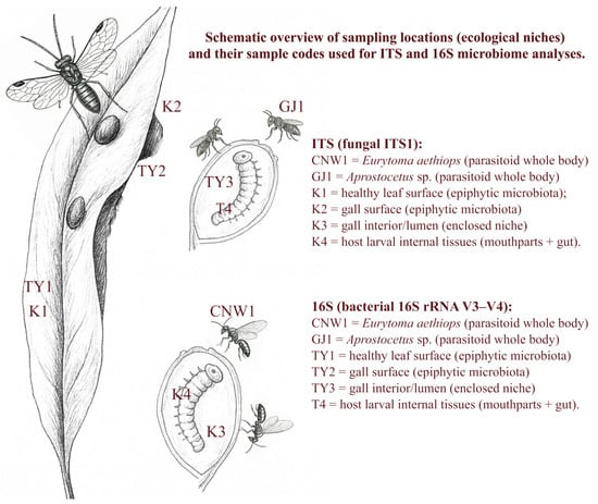 Leaf galls induced on willow by E. viminalis were sampled in Bosten Lake National Wetland Park, Bohu County, Bayingolin Mongolian Autonomous Prefecture, Xinjiang, China (approx. 41.90° N, 86.70° E; ~1050 m a.s.l.) on 15 September 2023, which coincided with peak galling and parasitoid activity. Three transects (>200 m apart) were established; within each transect, one biological replicate per niche was collected at a randomized position ≥30 m from other collection sites. The sampling order was computer randomized, and labeling and DNA extraction were performed by the same operator, who was blinded to group identity [49]. We defined six ecological niches for microbiome profiling in this tri-trophic willow–gall–parasitoid system: (1) healthy leaf surface, (2) gall surface, (3) gall lumen/interior, (4) host larval internal tissues, (5) parasitoid body of Eurytoma aethiops, and (6) parasitoid body of Aprostocetus sp. The leaf surface and gall surface represent exposed epiphytic niches and were sampled by collecting surface-associated microbial material without surface sterilization. The gall lumen/interior represents an enclosed niche and was collected after disinfecting the gall surface and aseptically opening the gall to obtain lumen material and inner-wall biofilm. E. viminalis larval internal tissues represent an enclosed internal niche and were collected after larval surface disinfection followed by aseptic dissection of internal tissues (mouthparts + gut). Parasitoid microbiomes were obtained from pooled adult individuals processed as whole bodies. Niche codes used in the ITS dataset include CNW1, GJ1, K1–K4, and those used in the 16S dataset include CNW1, GJ1, TY1–TY3, and T4 (Figure 2). Each niche comprised three independent biological replicates (n = 3). Plant-derived replicates were taken from different plants/galls; parasitoid replicates consisted of within-replicate pools (median 15 individuals; range 10–20) and were treated as the experimental unit. Leaf and gall surfaces were processed as epiphytic microbiota without surface sterilization. For gall-interior niches (K3/TY3), galls were surface-sterilized (70% ethanol, 30 s; 1% NaClO, 60 s; three sterile-water rinses) and opened aseptically, after which the larvae of E. viminalis were removed. Lumen contents together with inner-wall biofilms were collected by sterile scraping and swabbing, according to aseptic techniques used in insect microbiome studies [50]. In the host, larvae were surface-sterilized as described above and dissected under a stereomicroscope, and their mouthparts and gut were isolated and pooled for each replicate, following procedures adapted for insect gut microbial community profiling [51]. Parasitoid wasps were processed as whole individuals and cryopulverized in liquid nitrogen without prior surface sterilization to reflect the intact parasitoid-associated microbiome. This method captures both internal and surface-associated symbionts and has been successfully applied to hymenopteran parasitoids [52,53]. All procedures involved the use of sterile gloves and instruments to minimize contamination; samples were flash-frozen and stored at −80 °C to preserve microbial DNA integrity [54]. Because larvae and gall interiors occupy enclosed microhabitats, our surface sterilization and aseptic handling are expected to minimize background contamination; given the small size and dissection constraints of parasitoid wasps, we processed whole individuals to comprehensively profile the symbiotic microbiota.