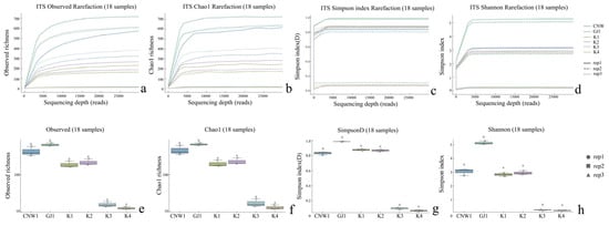 The sequencing depth was adequate for both the ITS and 16S datasets: the rarefaction curves reached clear plateaus for the Shannon and Simpson indices at low read counts and approached saturation for richness at greater depths (ITS ≈15–20k reads; 16S ≈20–30k reads), with consistent trajectories among biological replicates (Figure 4 and Figure 5). All downstream α diversity comparisons were therefore made at standardized depths (ITS: 29,848 reads; 16S: 35,080 reads per sample).