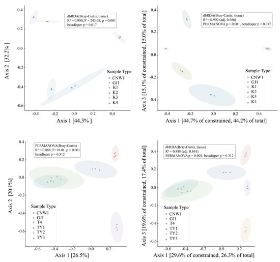 Bray–Curtis PCoA resolved a coherent niche structure in both marker datasets (Figure 7a,c). In the ITS ordination (Axis 1 = 44.3%, Axis 2 = 32.2%; Figure 7a), the two parasitoids—CNW1 (E. aethiops) and GJ1 (Aprostocetus sp.)—clustered tightly with partial overlap, indicating highly similar fungal assemblages. The two epiphytic plant niches (K1, healthy leaf surface; K2, gall surface) also grouped together with modest separation, whereas the gall interior (K3) and host larval internal tissues (K4) were distinctly isolated from all the other niches, which was consistent with strong compositional filtering in enclosed microhabitats. PERMANOVA supported a pronounced tissue effect (R2 = 0.990, F = 236.68, p = 0.001). Differences in multivariate dispersion were detected (betadisper p = 0.017), suggesting that unequal within-group variance modestly accentuated ITS separation. The tissue-constrained dbRDA (Figure 7b) recapitulated and sharpened the centroid differences (constrained R2 = 0.990; adj. R2 = 0.986), preserving the neighborhood structure of parasitoids (nearest neighbors), epiphytic surfaces (K1≈K2), and the two enclosed habitats (K3, K4) as endpoints. The 16S data exhibited the same hierarchy but with a clearer compositional basis (PCoA Axis 1 = 26.5%, Axis 2 = 22.9%; Figure 7c): parasitoids again formed a compact cluster; TY1 (leaf surface) and TY2 (gall surface) were adjacent with partial overlap; TY3 (gall interior) separated from surfaces; and T4 (host internal tissues) was most distinct. The PERMANOVA results remained significant (R2 = 0.888, F = 19.01, p = 0.001), whereas dispersion was homogeneous (betadisper p = 0.312), indicating that the 16S structure primarily reflected shifts in community centroids rather than variance artifacts. dbRDA constrained by tissue (Figure 7d) yielded congruent patterns with high explanatory power (constrained R2 = 0.889; adj. R2 = 0.841).