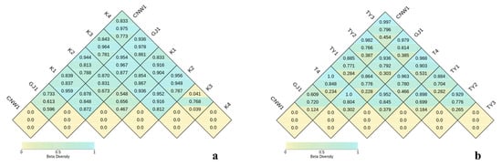 Pairwise β-diversity heatmaps (ITS: (a); 16S: (b)). Cells show between-group dissimilarity (0–1); darker colors indicate greater differences.