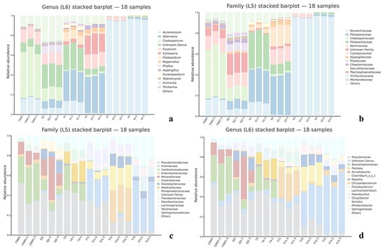 Community composition by niche (ITS: (a,b)); 16S: (c,d). Stacked bar plots at the family (a,c) and genus (b,d) levels; bars are samples grouped by niche.