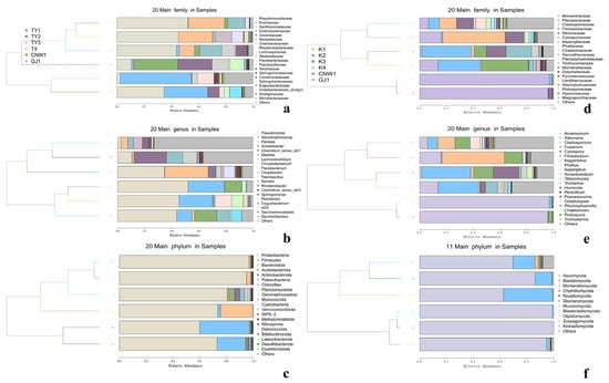 Dendrogram–bar plots by niche (ITS: (a–c); 16S: (d–f)). UPGMA trees (left) and stacked bars (right) show the relative abundance of the top taxa (family/genus), with branch lengths reflecting compositional similarity among niches.