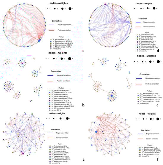 Co-occurrence networks (ITS: (a–c); 16S: (d–f)). Nodes are colored by phylum and scaled by degree/abundance; edges show correlations (red, positive; blue, negative). Three layouts (circular, modular, and force-directed) highlight hubs and modules.