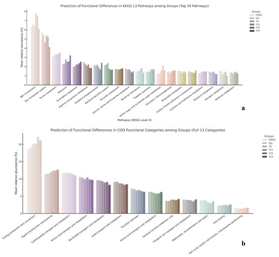 Predicted bacterial functions from 16S (PICRUSt2). (a) KEGG level-3 pathways (top 20) summarized by group; (b) COG functional categories (13) summarized by group.