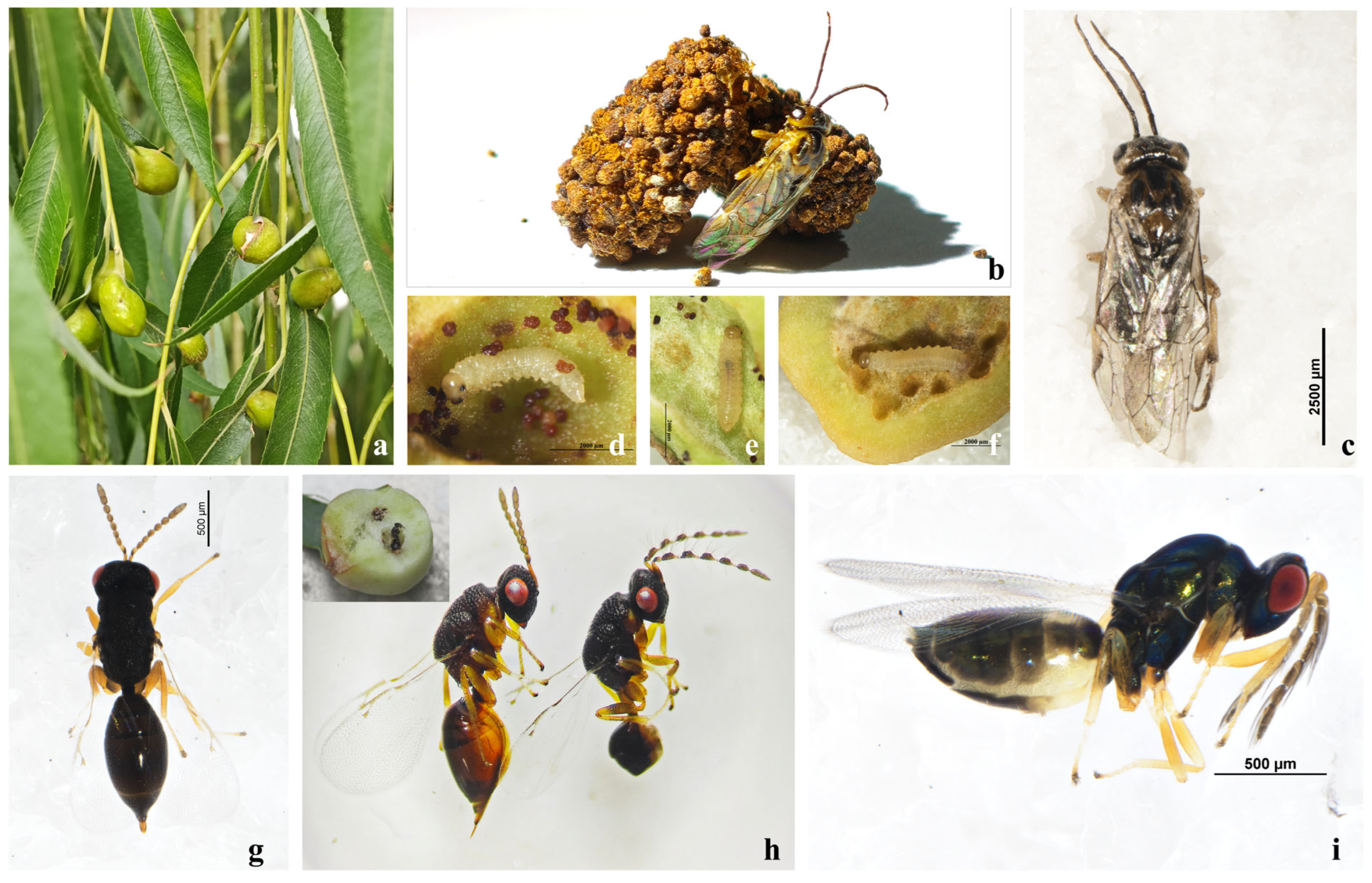 - Kopelke, J.-P. Natural enemies of gall-forming sawflies on willows (Salix spp.) (Hymenoptera: Tenthredinidae: Euura, Phyllocolpa, Pontania). Entomol. Gen. 2003, 26, 277–312. [Google Scholar] [CrossRef]