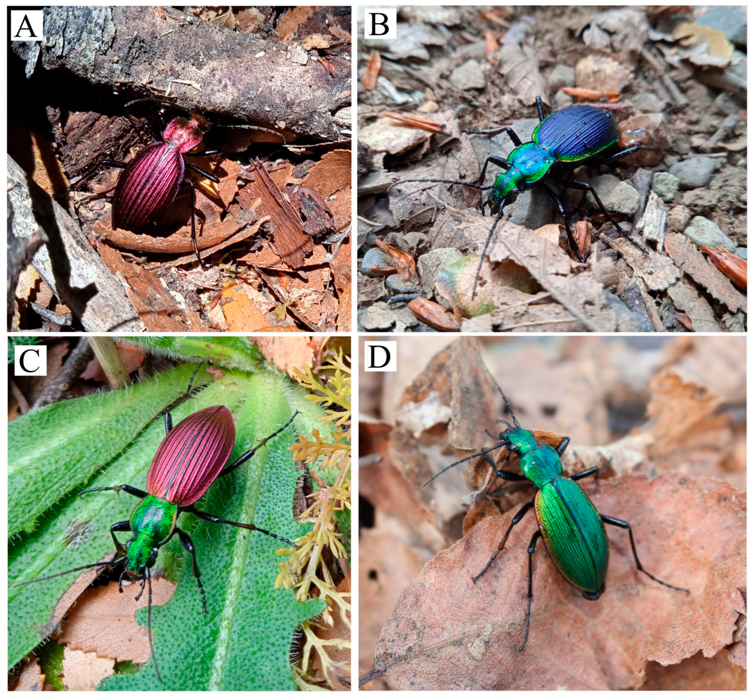- Weng, Y.M.; Kavanaugh, D.H.; Rubio-Perez, B.; Salman, J.; Kats, M.A.; Schoville, S.D. The genomic landscape of metallic color variation in ground beetles. bioRxiv 2023. [Google Scholar] [CrossRef]